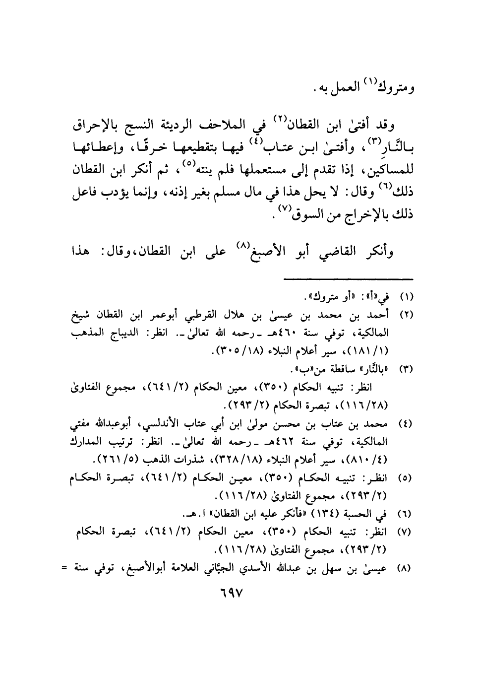 وقد أفتى ابن القطان (¬٢) في الملاحف الرديئة النسج بالإحراق بالنَّارِ (¬٣)، وأفتى ابن عتاب (¬٤) فيها بتقطيعها خرقًا، وإعطائها للمساكين، إذا تقدم إلى مستعملها فلم ينته (¬٥)، ثم أنكر ابن القطان ذلك (¬٦) وقال: لا يحل هذا في مال مسلم بغير إذنه، وإنما يؤدب فاعل ذلك بالإخراج من السوق (¬٧).