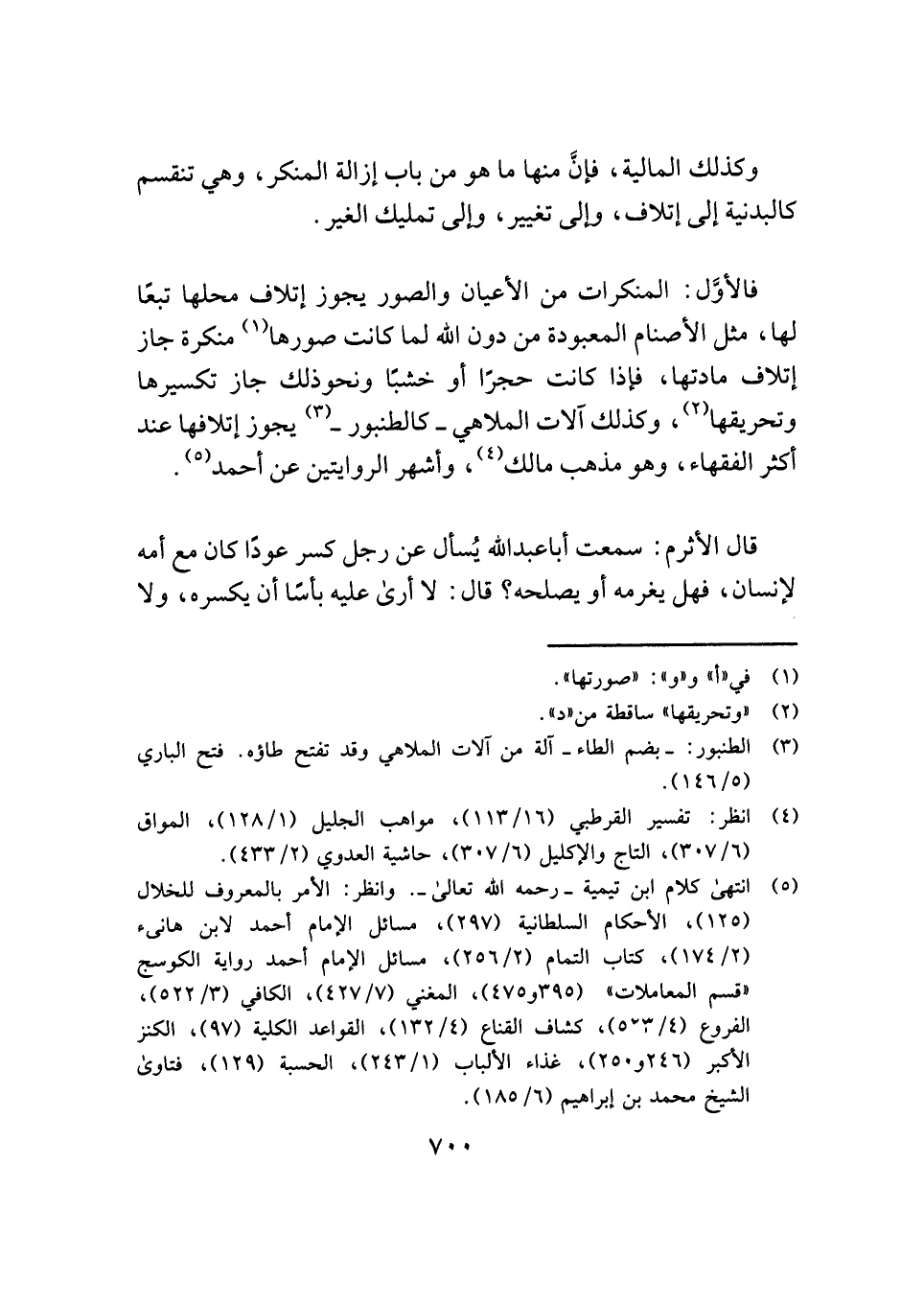 فالأوَّل: المنكرات من الأعيان والصور يجوز إتلاف محلها تبعًا لها، مثل الأصنام المعبودة من دون الله لما كانت صورها (¬١) منكرة جاز إتلاف مادتها، فإذا كانت حجرًا أو خشبًا ونحو ذلك جاز تكسيرها وتحريقها (¬٢)، وكذلك آلات الملاهي - كالطنبور - (¬٣) يجوز إتلافها عند أكثر الفقهاء، وهو مذهب مالك (¬٤)، وأشهر الروايتين عن أحمد (¬٥).