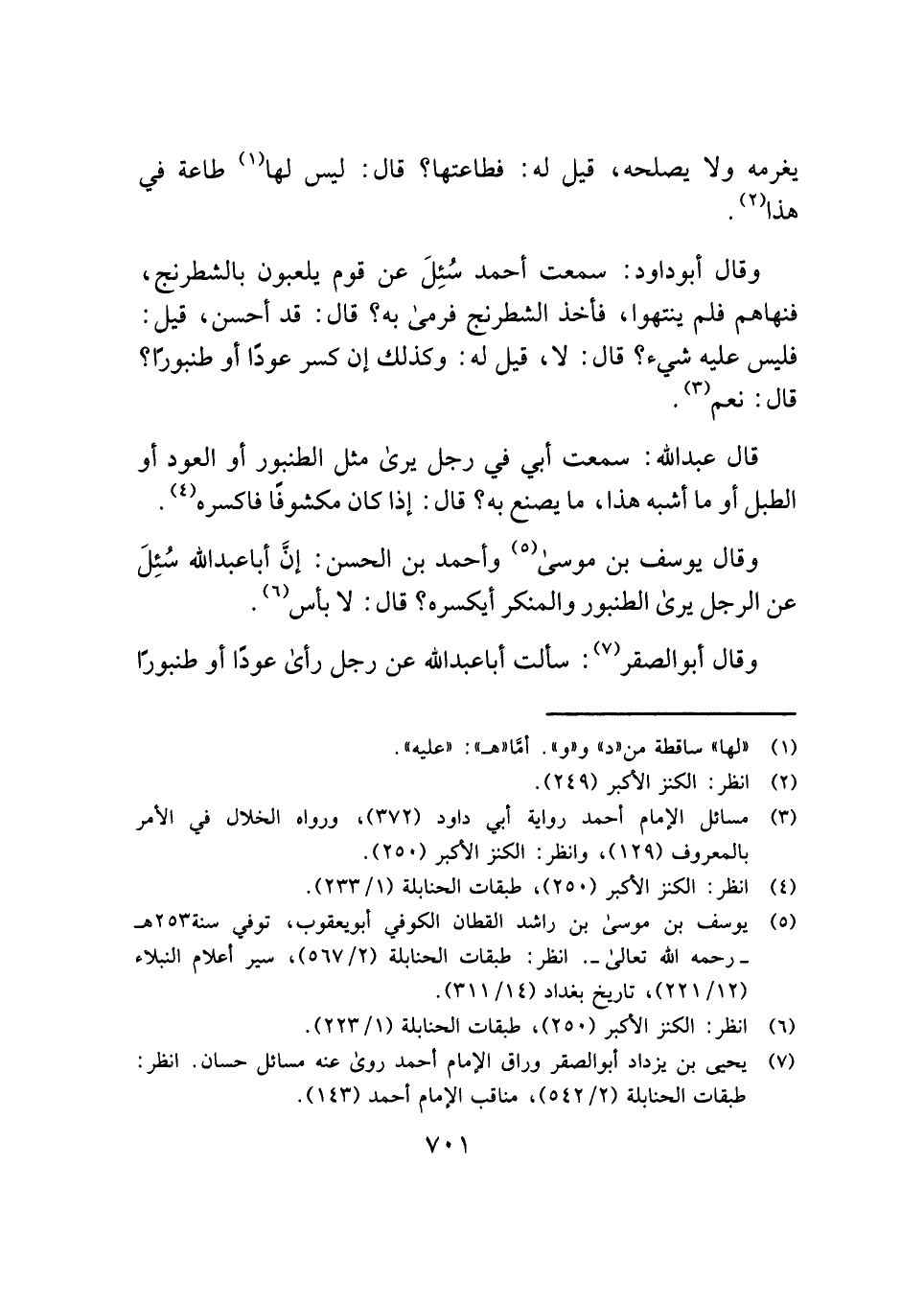 وقال أبو الصقر (¬٧): سألت أبا عبد الله عن رجل رأى عودًا أو طنبورًا