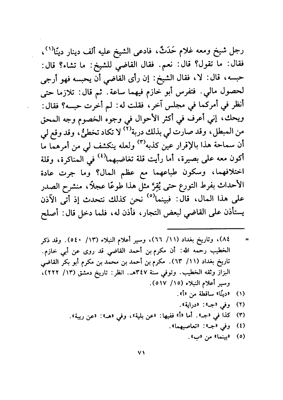 رجل شيخ ومعه غلام حَدَثٌ، فادعى الشيخ عليه ألف دينار دينًا (¬١)، فقال: ما تقول؟ قال: نعم. فقال القاضي للشيخ: ما تشاء؟ قال: حبسه، قال: لا، فقال الشيخ: إن رأى القاضي أن يحبسه فهو أرجى لحصول مالي. فتفرس أبو خازم فيهما ساعة. ثم قال: تلازما حتى أنظر في أمركما في مجلس آخر، فقلت له: لم أخرت حبسه؟ فقال: ويحك، إني أعرف في أكثر الأحوال في وجوه الخصوم وجه المحق من المبطل، وقد صارت لي بذلك دربة (¬٢) لا تكاد تخطئُ، وقد وقع لي أن سماحة هذا بالإقرار عين كذبه (¬٣) ولعله ينكشف لي من أمرهما ما أكون معه على بصيرة، أما رأيت قلة تغاضبهما (¬٤) في المناكرة، وقلة اختلافهما، وسكون طباعهما مع عظم المال؟ وما جرت عادة الأحداث بفرط التورع حتى يُقِرَّ مثل هذا طوعًا عجلًا، منشرح الصدر على هذا المال، قال: فبينما (¬٥) نحن كذلك نتحدث إذ أتى الآذن يستأذن على القاضي لبعض التجار، فأذن له، فلما دخل قال: أصلح