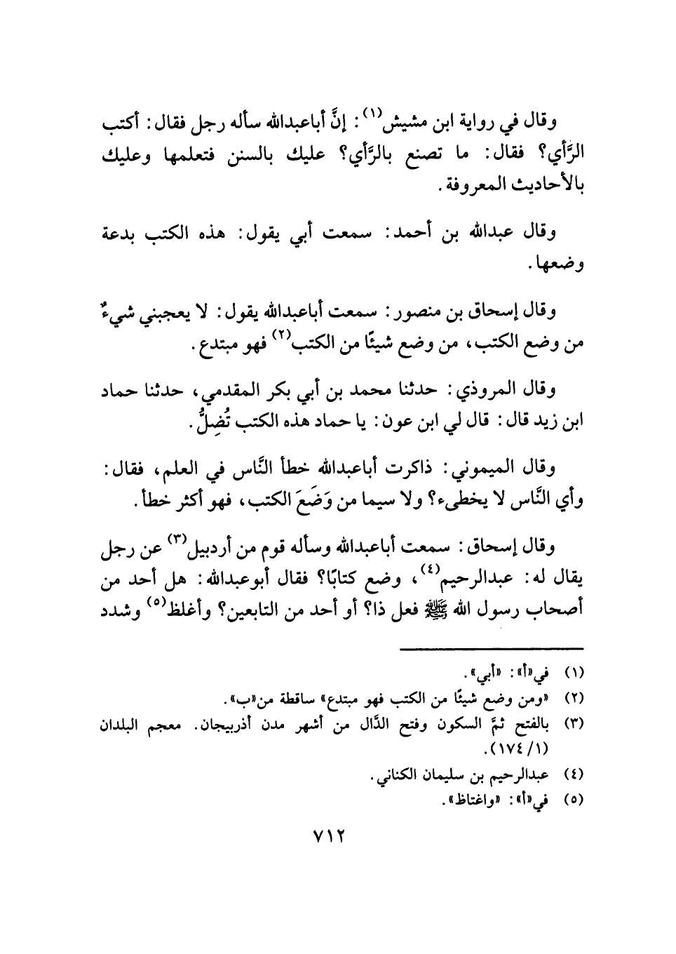 وقال إسحاق: سمعت أبا عبد الله وسأله قوم من أردبيل (¬٣) عن رجل يقال له: عبد الرحيم (¬٤)، وضع كتابًا؟ فقال أبو عبد الله: هل أحد من أصحاب رسول الله - صلى الله عليه وسلم - فعل ذا؟ أو أحد من التابعين؟ وأغلظ (¬٥) وشدد