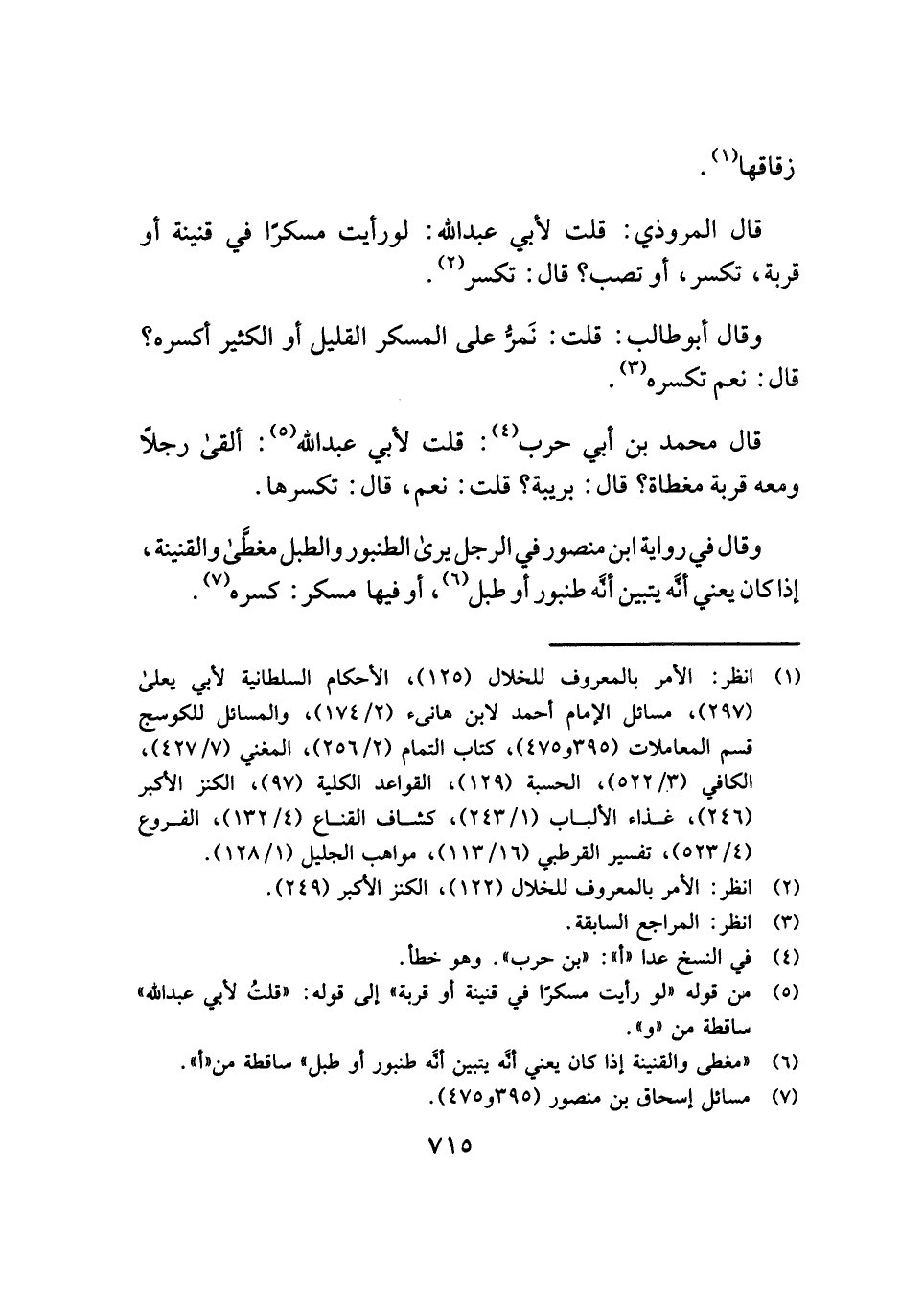 (¬٥) من قوله "لو رأيت مسكرًا في قنينة أو قربة" إلى قوله: "قلتُ لأبي عبد الله" ساقطة من "و".