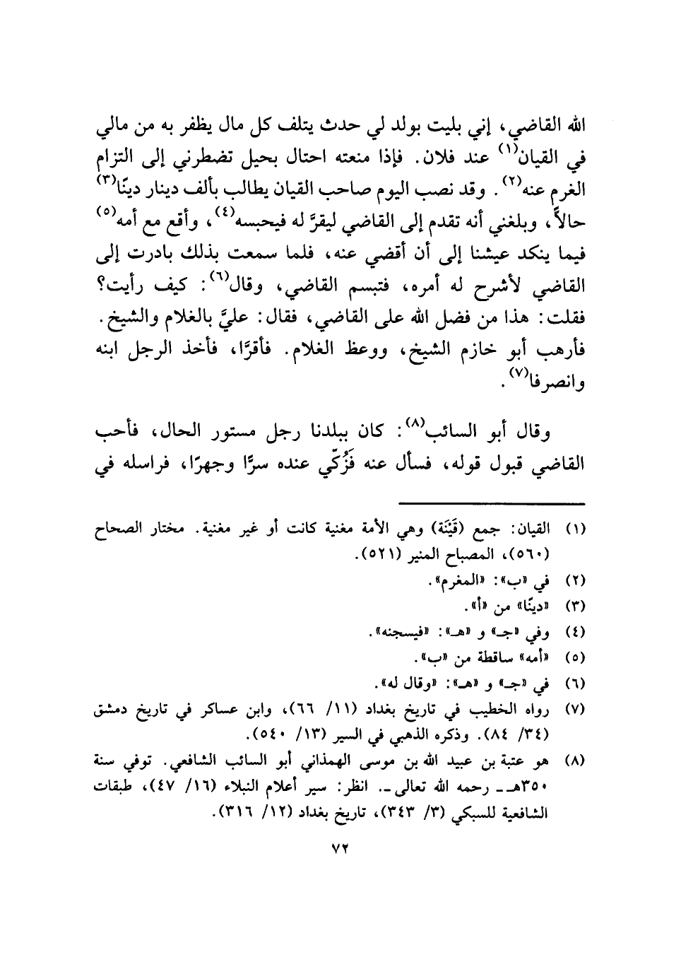 (¬٧) رواه الخطيب في تاريخ بغداد (١١/ ٦٦)، وابن عساكر في تاريخ دمشق (٣٤/ ٨٤). وذكره الذهبي في السير (١٣/ ٥٤٠).