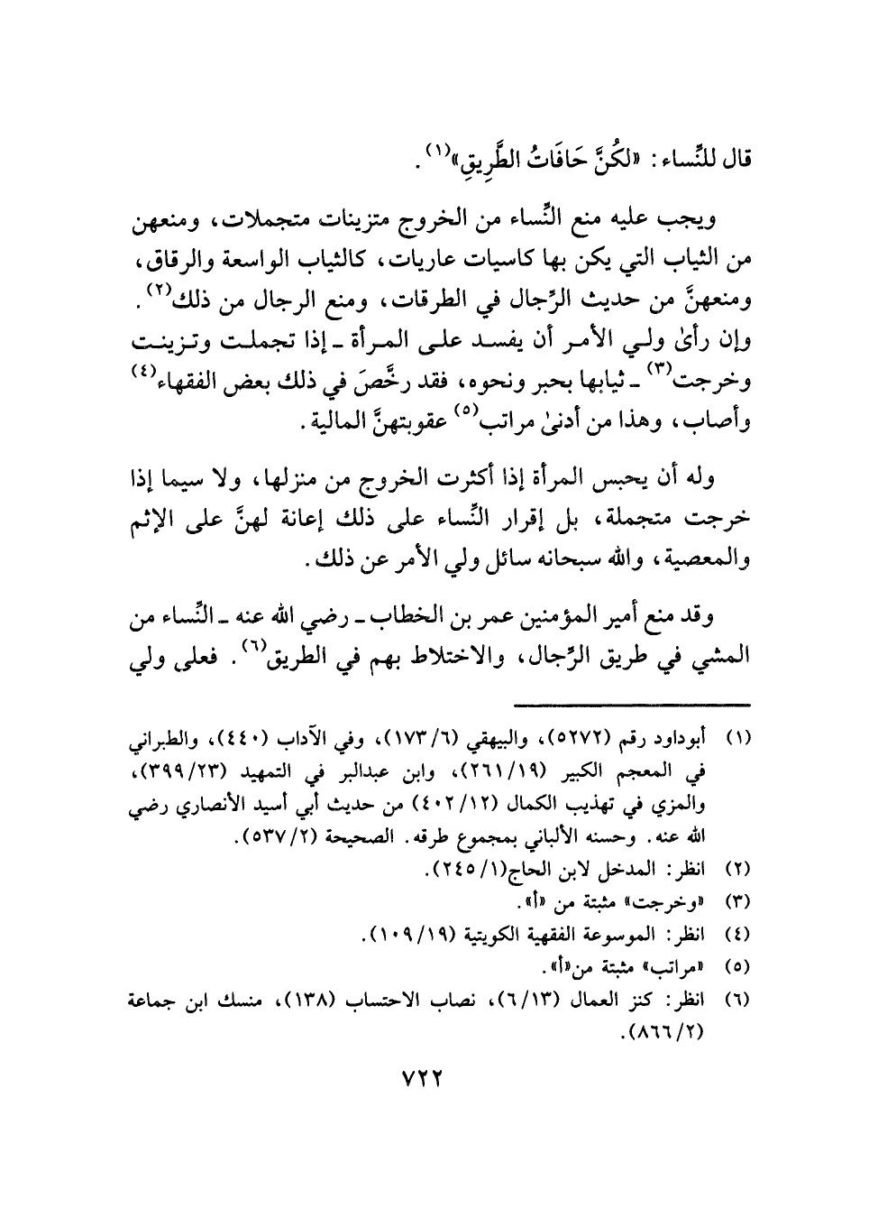 وقد منع أمير المؤمنين عمر بن الخطاب - رضي الله عنه - النِّساء من المشي في طريق الرِّجال، والاختلاط بهم في الطريق (¬٦). فعلى ولي