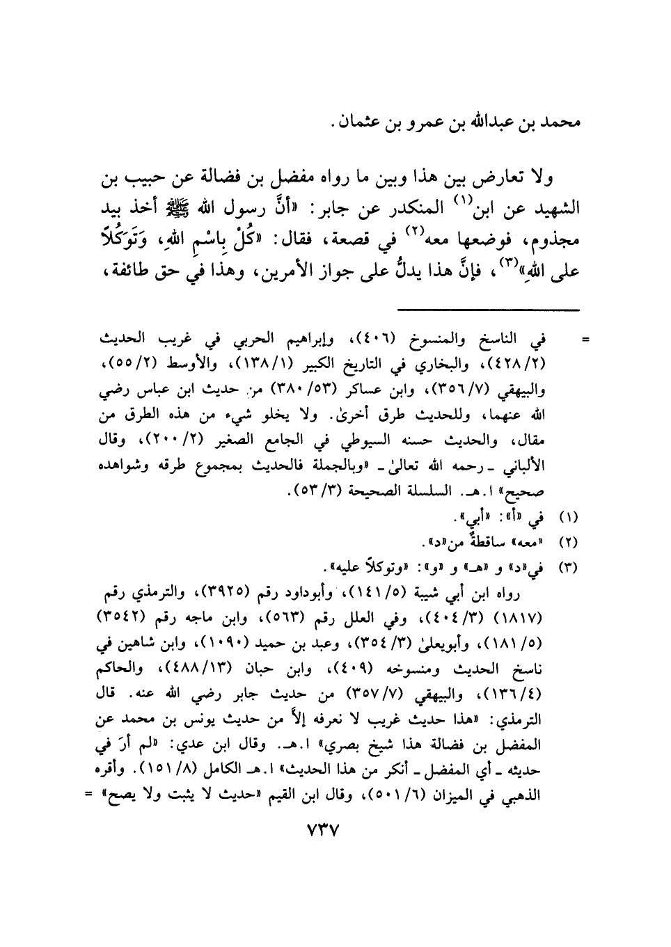 رواه ابن أبي شيبة (٥/ ١٤١)، وأبو داود رقم (٣٩٢٥)، والترمذي رقم (١٨١٧) (٣/ ٤٠٤)، وفي العلل رقم (٥٦٣)، وابن ماجه رقم (٣٥٤٢) (٥/ ١٨١)، وأبو يعلى (٣/ ٣٥٤)، وعبد بن حميد (١٠٩٠)، وابن شاهين في ناسخ الحديث ومنسوخه (٤٠٩)، وابن حبان (١٣/ ٤٨٨)، والحاكم (٤/ ١٣٦)، والبيهقي (٧/ ٣٥٧) من حديث جابر رضي الله عنه. قال الترمذي: "هذا حديث غريب لا نعرفه إلَّا من حديث يونس بن محمد عن المفضل بن فضالة هذا شيخ بصري" ا. هـ. وقال ابن عدي: "لم أرَ في حديثه - أي المفضل - أنكر من هذا الحديث" ا. هـ الكامل (٨/ ١٥١). وأقره الذهبي في الميزان (٦/ ٥٠١)، وقال ابن القيم "حديث لا يثبت ولا يصح" =