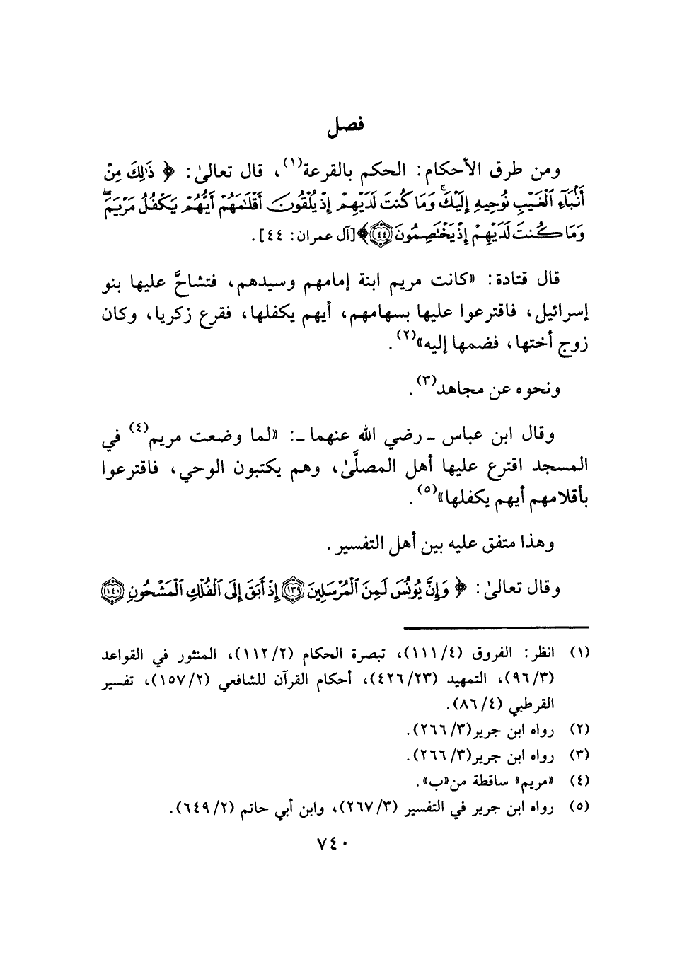 وقال ابن عباس - رضي الله عنهما -: "لما وضعت مريم (¬٤) في المسجد اقترع عليها أهل المصلَّى، وهم يكتبون الوحي، فاقترعوا بأقلامهم أيهم يكفلها" (¬٥).
