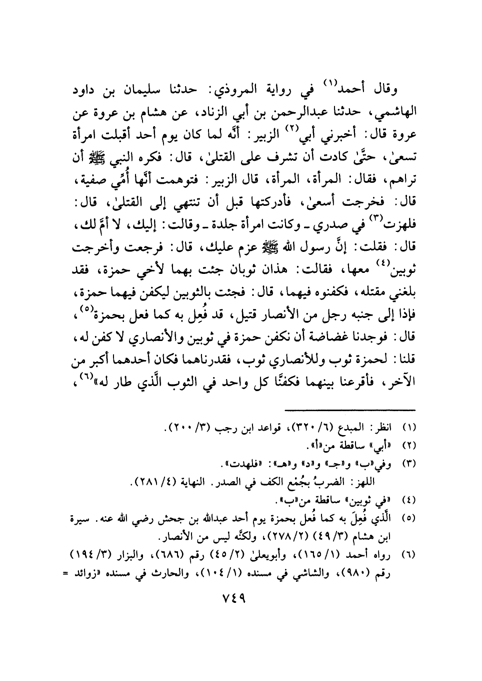 وقال أحمد (¬١) في رواية المروذي: حدثنا سليمان بن داود الهاشمي، حدثنا عبد الرحمن بن أبي الزناد، عن هشام بن عروة عن عروة قال: أخبرني أبي (¬٢) الزبير: أنَّه لما كان يوم أحد أقبلت امرأة تسعى، حتَّى كادت أن تشرف على القتلى، قال: فكره النبي - صلى الله عليه وسلم - أن تراهم، فقال: المرأة، المرأة، قال الزبير: فتوهمت أنَّها أُمِّي صفية، قال: فخرجت أسعى، فأدركتها قبل أن تنتهي إلى القتلى، قال: فلهزت (¬٣) في صدري - وكانت امرأة جلدة - وقالت: إليك، لا أمَّ لك، قال: فقلت: إنَّ رسول الله - صلى الله عليه وسلم - عزم عليك، قال: فرجعت وأخرجت ثوبين (¬٤) معها، فقالت: هذان ثوبان جئت بهما لأخي حمزة، فقد بلغني مقتله، فكفنوه فيهما، قال: فجئت بالثوبين ليكفن فيهما حمزة، فإذا إلى جنبه رجل من الأنصار قتيل، قد فُعِل به كما فعل بحمزة (¬٥)، قال: فوجدنا غضاضة أن نكفن حمزة في ثوبين والأنصاري لا كفن له، قلنا: لحمزة ثوب وللأنصاري ثوب، فقدرناهما فكان أحدهما أكبر من الآخر، فأقرعنا بينهما فكفنَّا كل واحد في الثوب الَّذي طار له" (¬٦)،