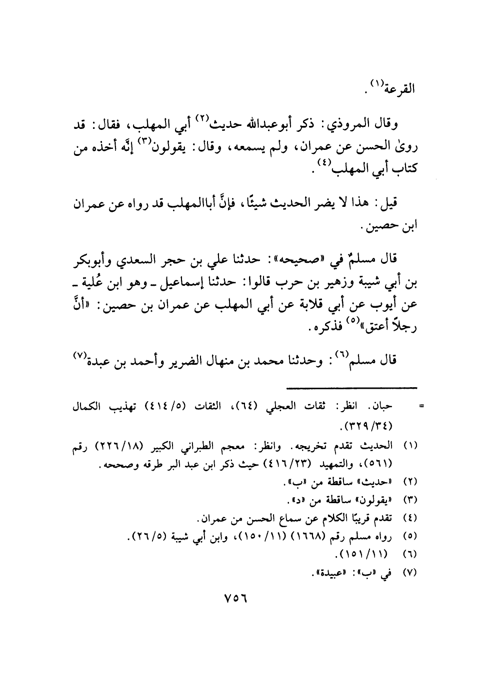 قال مسلمٌ في "صحيحه": حدثنا علي بن حجر السعدي وأبو بكر بن أبي شيبة وزهير بن حرب قالوا: حدثنا إسماعيل - وهو ابن عُلية - عن أيوب عن أبي قلابة عن أبي المهلب عن عمران بن حصين: "أنَّ رجلًا أعتق" (¬٥) فذكره.
