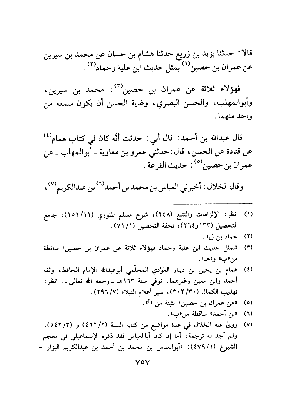 قالا: حدثنا يزيد بن زريع حدثنا هشام بن حسان عن محمد بن سيرين عن عمران بن حصين (¬١) بمثل حديث ابن علية وحماد (¬٢).
