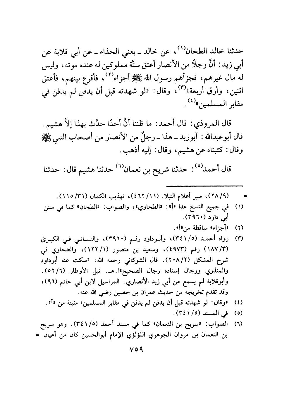 حدثنا خالد الطحان (¬١)، عن خالد - يعني الحذاء - عن أبي قلابة عن أبي زيد: أنَّ رجلًا من الأنصار أعتق ستَّة مملوكين له عنده موته، وليس له مال غيرهم، فجزأهم رسول الله - صلى الله عليه وسلم - أجزاء (¬٢)، فأقرع بينهم، فأعتق اثنين، وأرق أربعة" (¬٣)، وقال: "لو شهدته قبل أن يدفن لم يدفن في مقابر المسلمين" (¬٤).