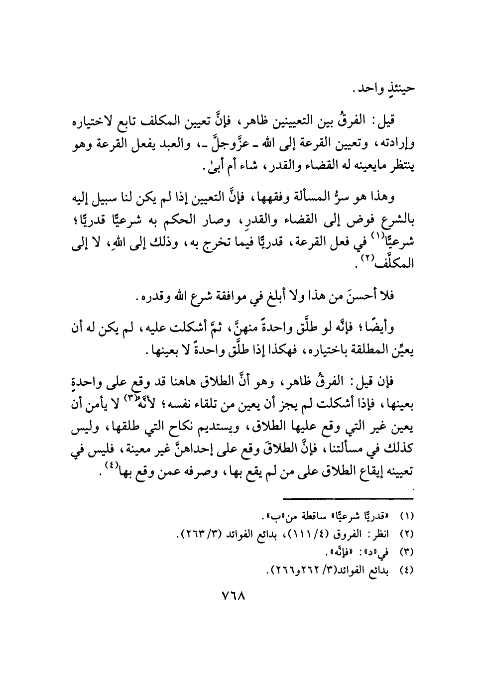 وهذا هو سرُّ المسألة وفقهها، فإنَّ التعيين إذا لم يكن لنا سبيل إليه بالشرع فوض إلى القضاء والقدرِ، وصار الحكم به شرعيًّا قدريًّا؛ شرعيًّا (¬١) في فعل القرعة، قدريًّا فيما تخرج به، وذلك إلى اللهِ، لا إلى المكلَّف (¬٢).