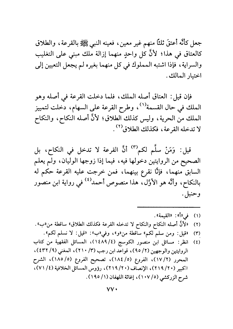 (¬٢) "لأنَّ أصله النكاح والنكاح لا تدخله القرعة فكذلك الطلاق" ساقطة من "ب".
