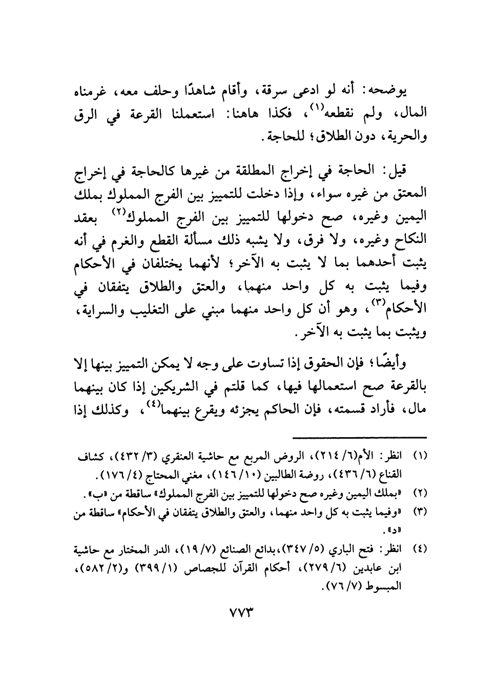 يوضحه: أنه لو ادعى سرقة، وأقام شاهدًا وحلف معه، غرمناه المال، ولم نقطعه (¬١)، فكذا ها هنا: استعملنا القرعة في الرق والحرية، دون الطلاق؛ للحاجة.