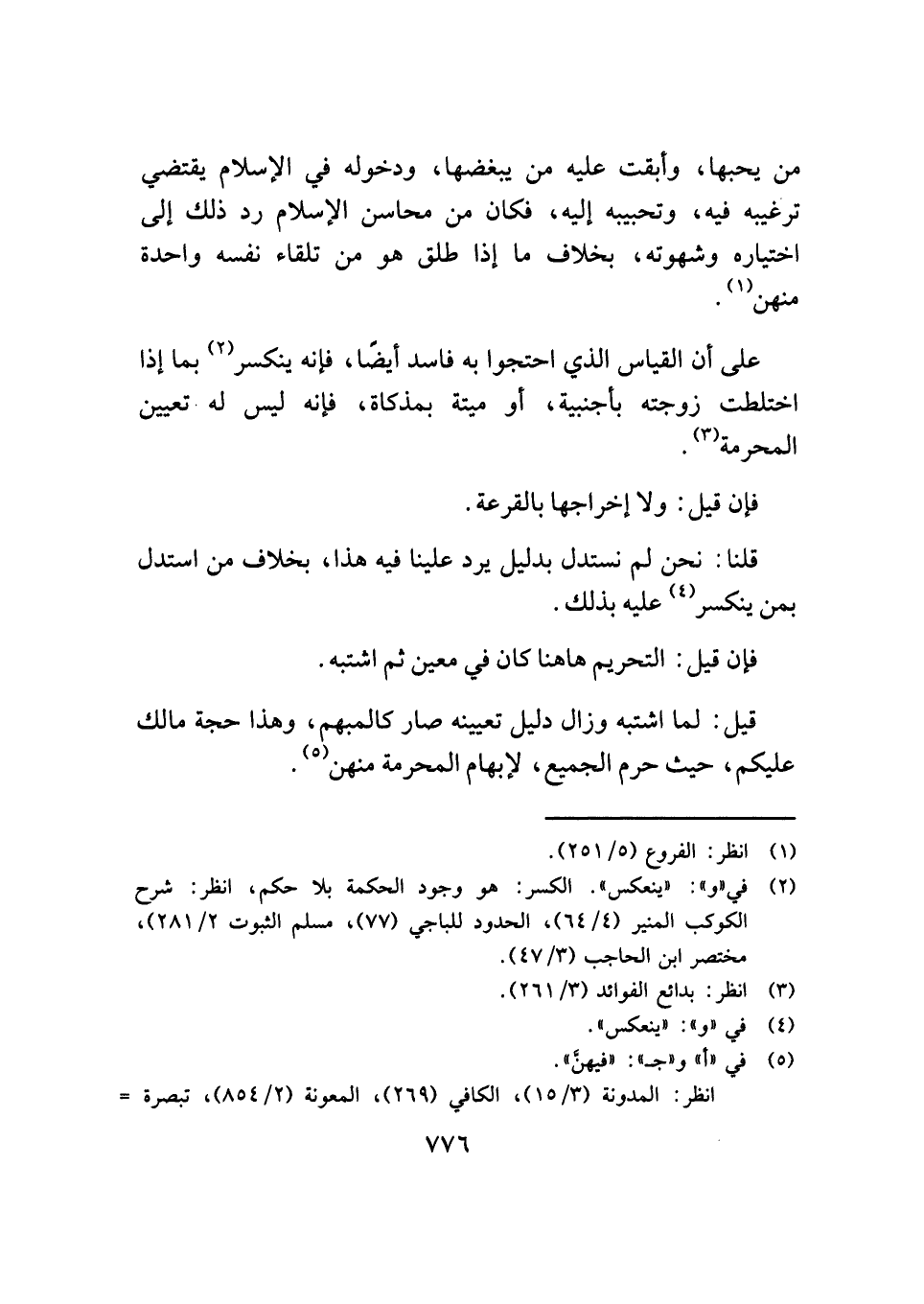 قيل: لما اشتبه وزال دليل تعيينه صار كالمبهم، وهذا حجة مالك عليكم، حيث حرم الجميع، لإبهام المحرمة منهن (¬٥).