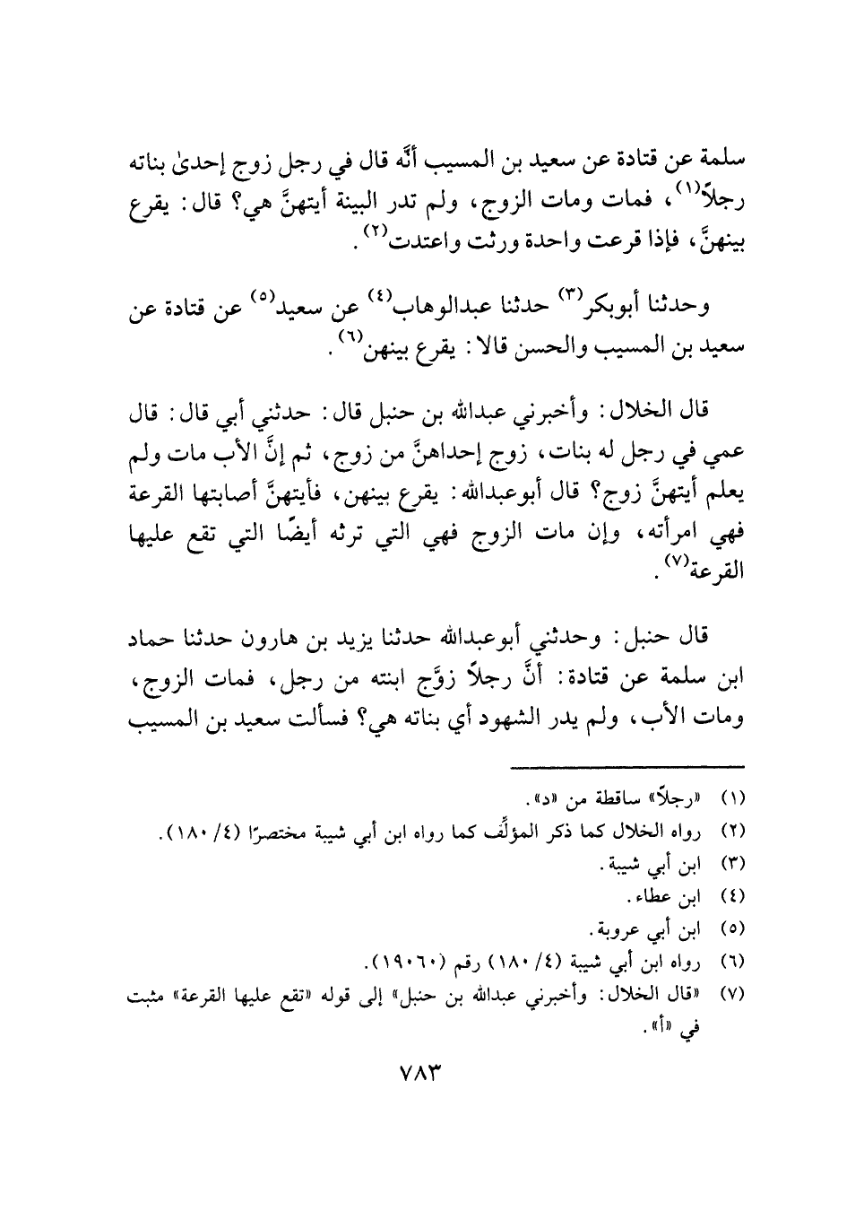 قال حنبل: وحدثني أبو عبد الله حدثنا يزيد بن هارون حدثنا حماد ابن سلمة عن قتادة: أنَّ رجلًا زوَّج ابنته من رجل، فمات الزوج، ومات الأب، ولم يدر الشهود أي بناته هي؟ فسألت سعيد بن المسيب