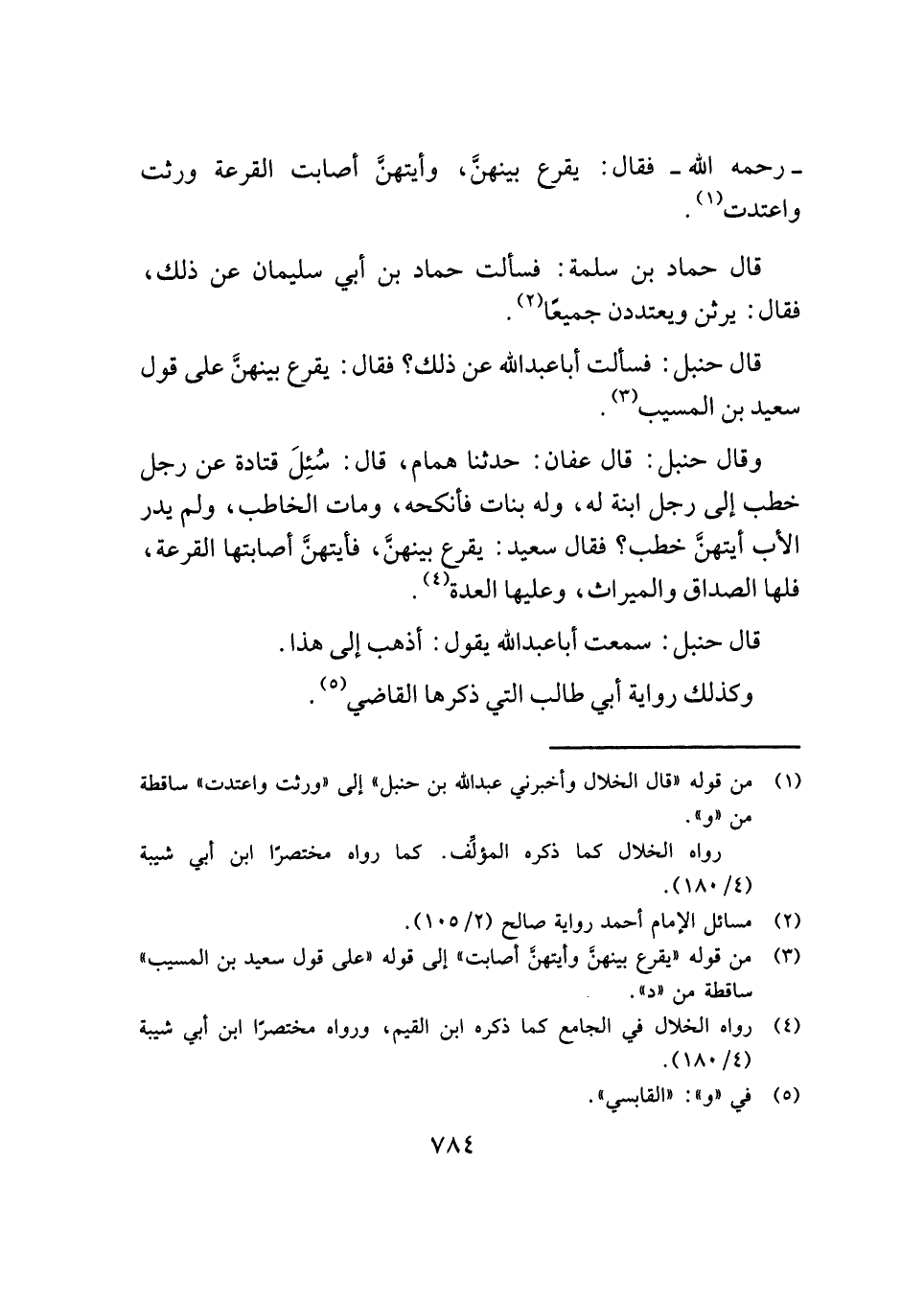 قال حنبل: فسألت أبا عبد الله عن ذلك؟ فقال: يقرع بينهنَّ على قول سعيد بن المسيب (¬٣).