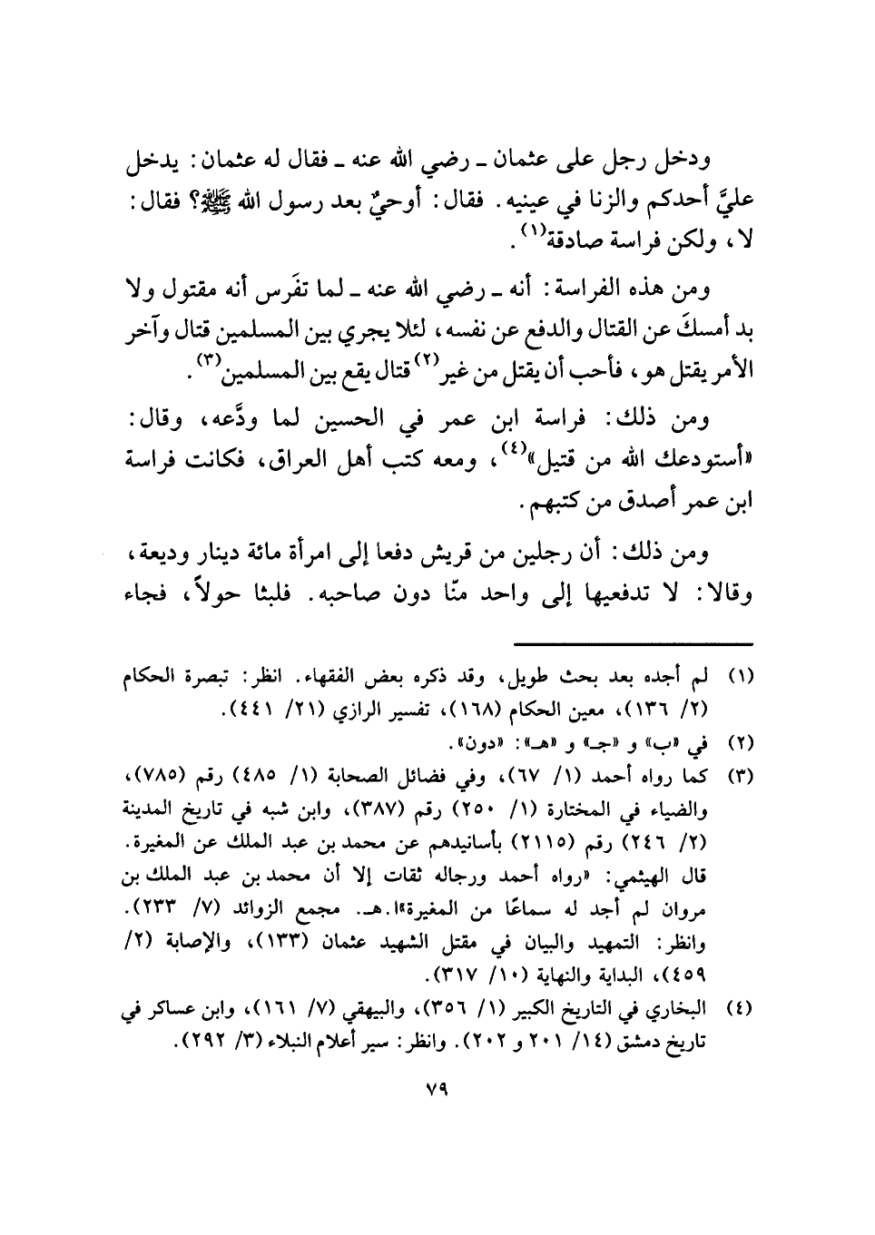 ودخل رجل على عثمان - رضي الله عنه - فقال له عثمان: يدخل عليَّ أحدكم والزنا في عينيه. فقال: أوحيٌ بعد رسول الله - صلى الله عليه وسلم -؟ فقال: لا, ولكن فراسة صادقة (¬١).