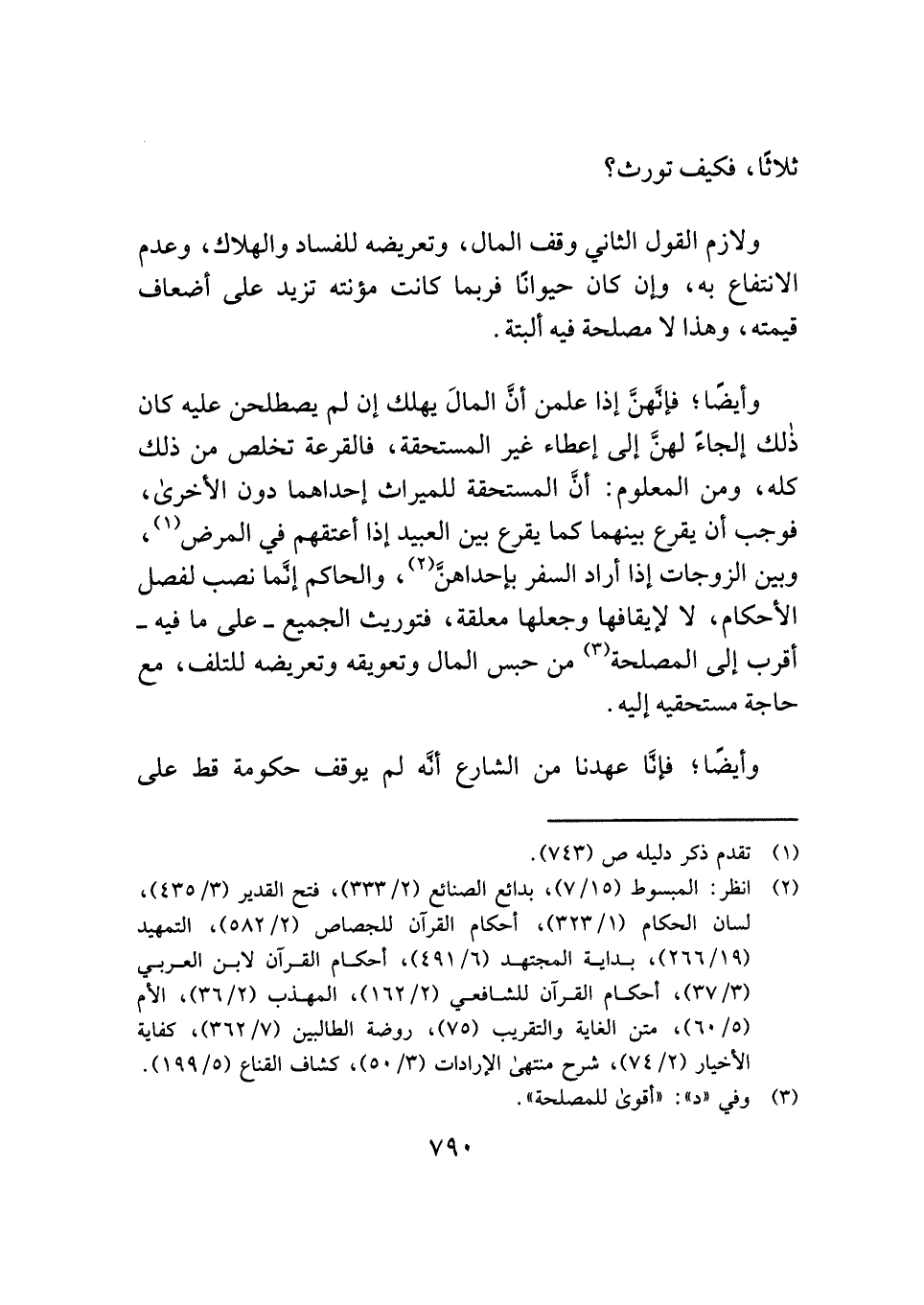 وأيضًا؛ فإنَّهنَّ إذا علمن أنَّ المالَ يهلك إن لم يصطلحن عليه كان ذلك إلجاءً لهنَّ إلى إعطاء غير المستحقة، فالقرعة تخلص من ذلك كله، ومن المعلوم: أنَّ المستحقة للميراث إحداهما دون الأخرى، فوجب أن يقرع بينهما كما يقرع بين العبيد إذا أعتقهم في المرض (¬١)، وبين الزوجات إذا أراد السفر بإحداهنَّ (¬٢)، والحاكم إنَّما نصب لفصل الأحكام، لا لإيقافها وجعلها معلقة، فتوريث الجميع - على ما فيه - أقرب إلى المصلحة (¬٣) من حبس المال وتعويقه وتعريضه للتلف، مع حاجة مستحقيه إليه.