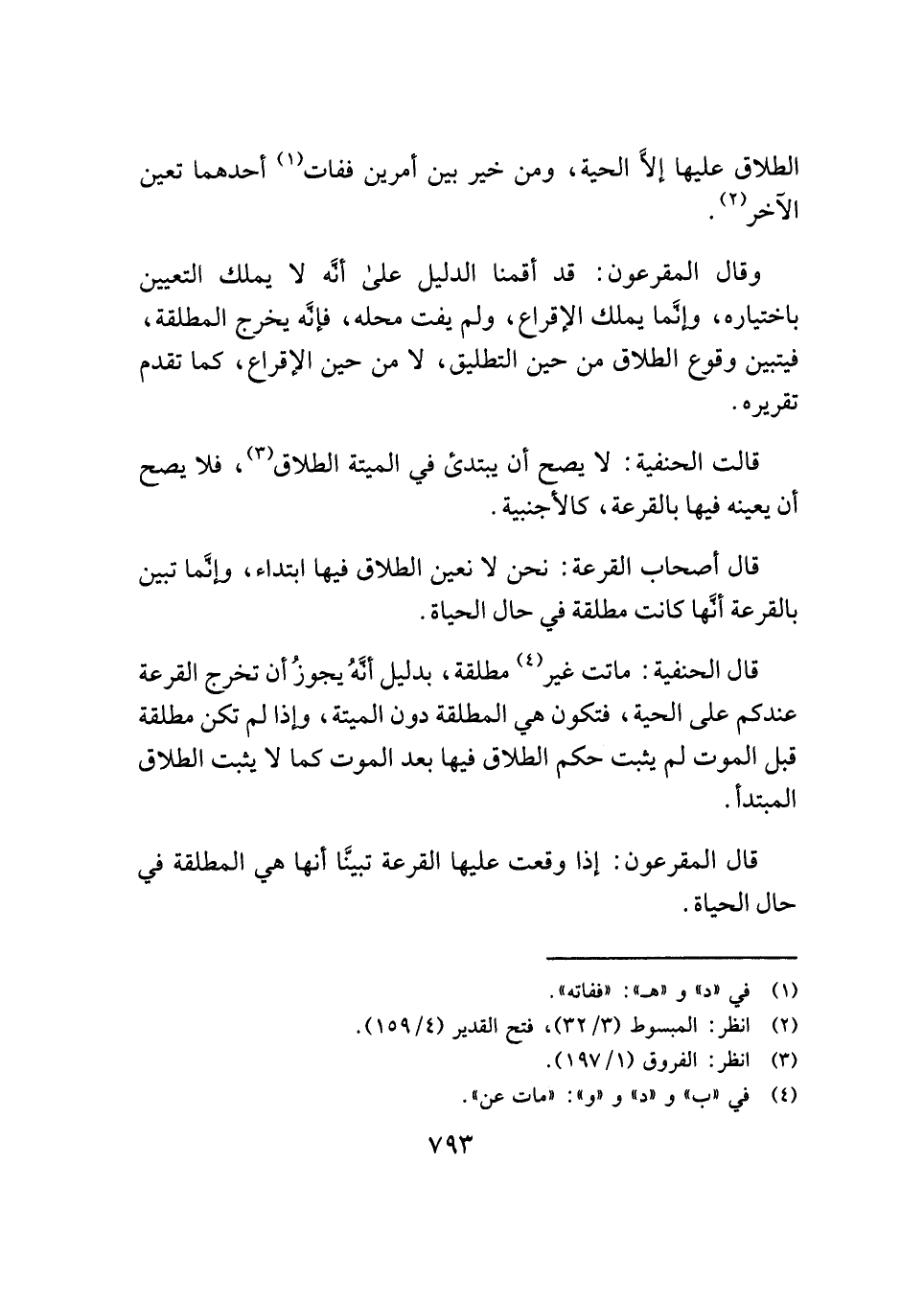 قال الحنفية: ماتت غير (¬٤) مطلقة، بدليل أنَّهُ يجوزُ أن تخرج القرعة عندكم على الحية، فتكون هي المطلقة دون الميتة، وإذا لم تكن مطلقة قبل الموت لم يثبت حكم الطلاق فيها بعد الموت كما لا يثبت الطلاق المبتدأ.