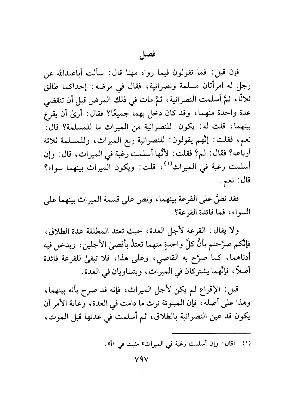 قيل: الإقراع لم يكن لأجل الميراث، فإنه قد صرح بأنه بينهما، وهذا على أصله، فإن المبتوتة ترث ما دامت في العدة، وغاية الأمر أن يكون قد عين النصرانية بالطلاق، ثم أسلمت في عدتها قبل الموت،
