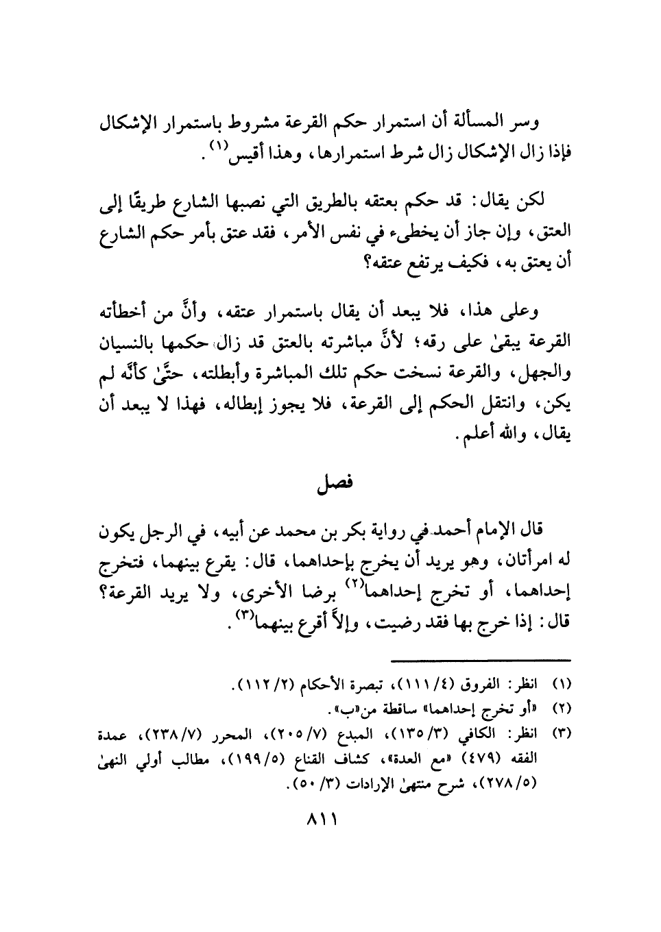 وعلى هذا، فلا يبعد أن يقال باستمرار عتقه، وأنَّ من أخطأته القرعة يبقى على رقه؛ لأنَّ مباشرته بالعتق قد زال حكمها بالنسيان والجهل، والقرعة نسخت حكم تلك المباشرة وأبطلته، حتَّى كأنَّه لم يكن، وانتقل الحكم إلى القرعة، فلا يجوز إبطاله، فهذا لا يبعد أن يقال، والله أعلم.