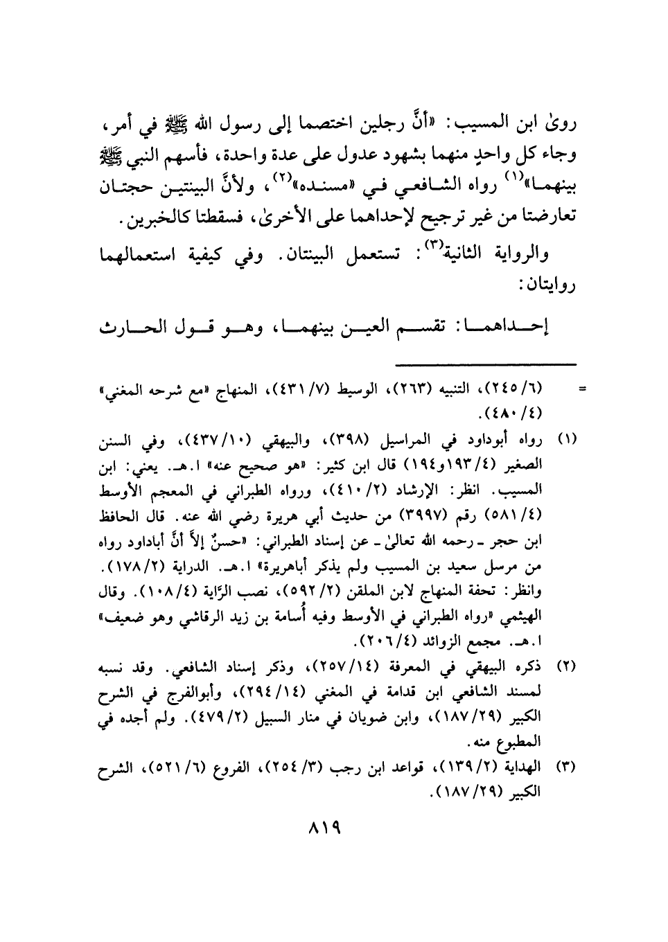 روى ابن المسيب: "أنَّ رجلين اختصما إلى رسول الله - صلى الله عليه وسلم - في أمر، وجاء كل واحدٍ منهما بشهود عدول على عدة واحدة، فأسهم النبي - صلى الله عليه وسلم - بينهما" (¬١) رواه الشافعي في "مسنده" (¬٢)، ولأنَّ البينتين حجتان تعارضتا من غير ترجيح لإحداهما على الأخرى، فسقطتا كالخبرين.