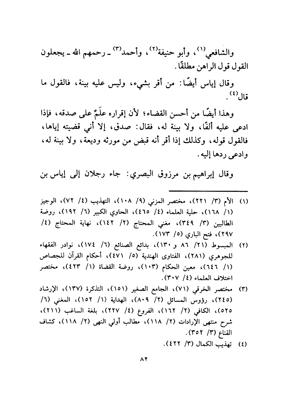 (¬٢) المبسوط (٢١/ ٨٦ و ١٣٠)، بدائع الصنائع (٦/ ١٧٤)، نوادر الفقهاء للجوهري (٢٨١)، الفتاوى الهندية (٥/ ٤٧١)، أحكام القرآن للجصاص (١/ ٦٤٦)، معين الحكام (١٠٣)، روضة القضاة (١/ ٤٢٣)، مختصر اختلاف العلماء (٤/ ٣٠٧).