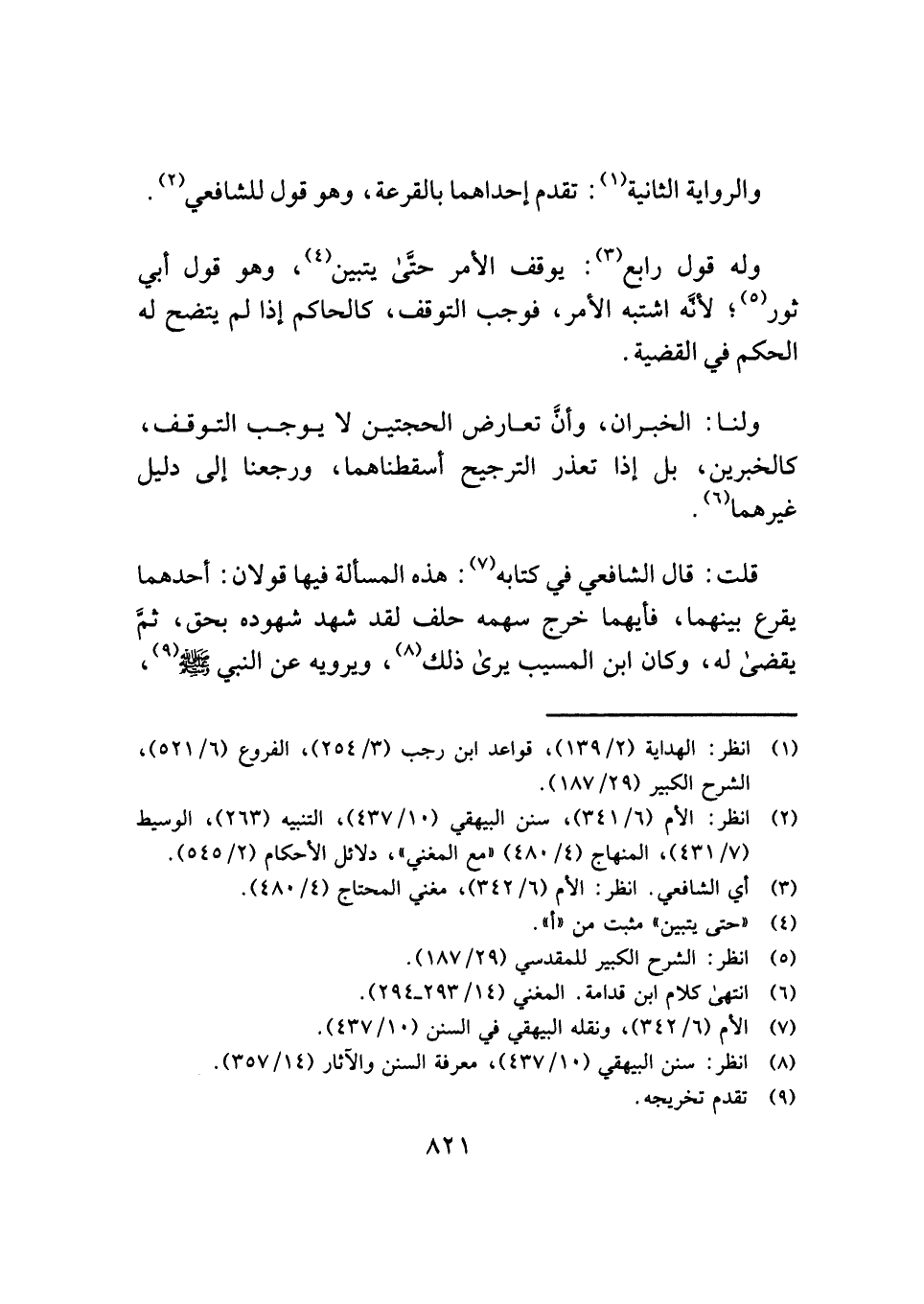 قلت: قال الشافعي في كتابه (¬٧): هذه المسألة فيها قولان: أحدهما يقرع بينهما، فأيهما خرج سهمه حلف لقد شهد شهوده بحق، ثمَّ يقضى له، وكان ابن المسيب يرى ذلك (¬٨)، ويرويه عن النبي - صلى الله عليه وسلم - (¬٩)،