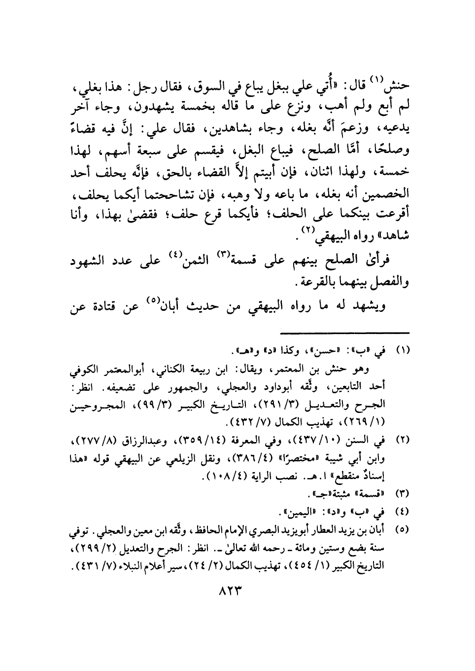 حنش (¬١) قال: "أُتي علي ببغل يباع في السوق، فقال رجل: هذا بغلي، لم أبع ولم أهب، ونزع على ما قاله بخمسة يشهدون، وجاء آخر يدعيه، وزعمَ أنَّه بغله، وجاء بشاهدين، فقال علي: إنَّ فيه قضاءً وصلحًا، أمَّا الصلح، فيباع البغل، فيقسم على سبعة أسهم، لهذا خمسة، ولهذا اثنان، فإن أبيتم إلَّا القضاء بالحق، فإنَّه يحلف أحد الخصمين أنه بغله، ما باعه ولا وهبه، فإن تشاححتما أيكما يحلف، أقرعت بينكما على الحلف؛ فأيكما قرع حلف؛ فقضى بهذا، وأنا شاهد" رواه البيهقي (¬٢).