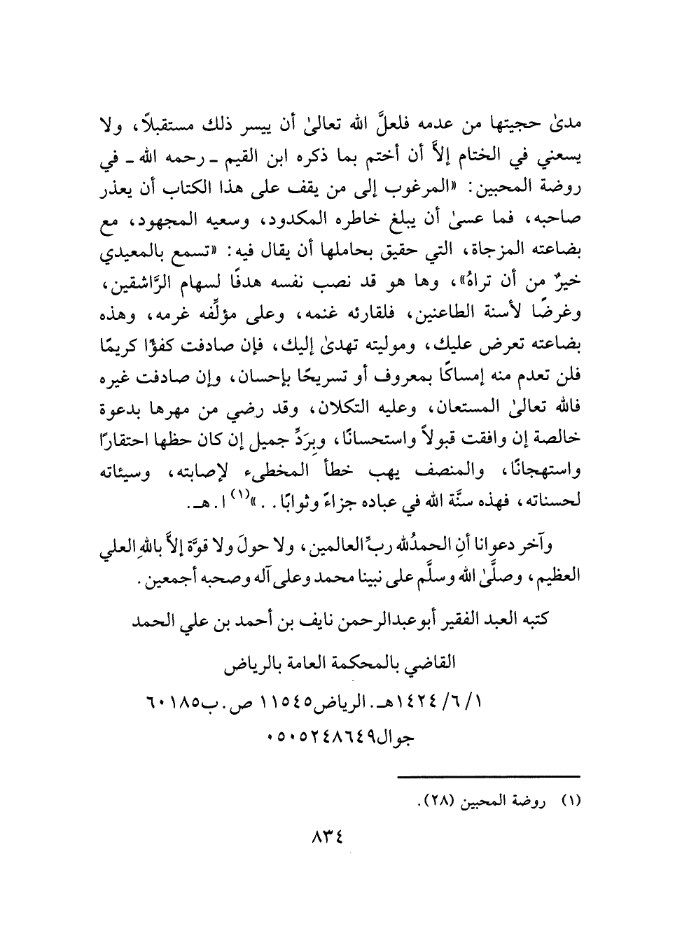 مدى حجيتها من عدمه فلعلَّ الله تعالى أن ييسر ذلك مستقبلًا، ولا يسعني في الختام إلَّا أن أختم بما ذكره ابن القيم - رحمه الله - في روضة المحبين: "المرغوب إلى من يقف على هذا الكتاب أن يعذر صاحبه، فما عسى أن يبلغ خاطره المكدود، وسعيه المجهود، مع بضاعته المزجاة، التي حقيق بحاملها أن يقال فيه: "تسمع بالمعيدي خيرٌ من أن تراهُ"، وها هو قد نصب نفسه هدفًا لسهام الرَّاشقين، وغرضًا لأسنة الطاعنين، فلقارئه غنمه، وعلى مؤلِّفه غرمه، وهذه بضاعته تعرض عليك، وموليته تهدى إليك، فإن صادفت كفؤًا كريمًا فلن تعدم منه إمساكًا بمعروف أو تسريحًا بإحسان، وإن صادفت غيره فالله تعالى المستعان، وعليه التكلان، وقد رضي من مهرها بدعوة خالصة إن وافقت قبولًا واستحسانًا، وبِرَدِّ جميل إن كان حظها احتقارًا واستهجانًا، والمنصف يهب خطأ المخطئ لإصابته، وسيئاته لحسناته، فهذه سنَّة الله في عباده جزاءً وثوابًا .. " (¬١) ا. هـ.