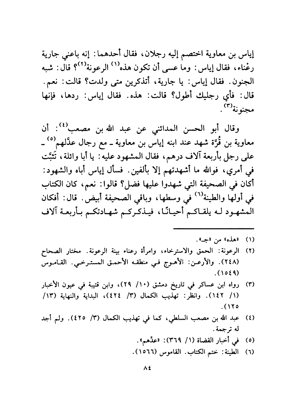 وقال أبو الحسن المدائني عن عبد الله بن مصعب (¬٤): أن معاوية بن قُرَّة شهد عند ابنه إياس بن معاوية - مع رجال عدَّلهم (¬٥) - على رجل بأربعة آلاف درهم، فقال المشهود عليه: يا أبا وائلة، تَثبَّت في أمري، فوالله ما أشهدتهم إلا بألفين. فسأل إياس أباه والشهود: أكان في الصحيفة التي شهدوا عليها فضل؟ قالوا: نعم، كان الكتاب في أولها والطينة (¬٦) في وسطها، وباقي الصحيفة أبيض. قال: أفكان المشهود له يلقاكم أحيانًا، فيذكركم شهادتكم بأربعة آلاف