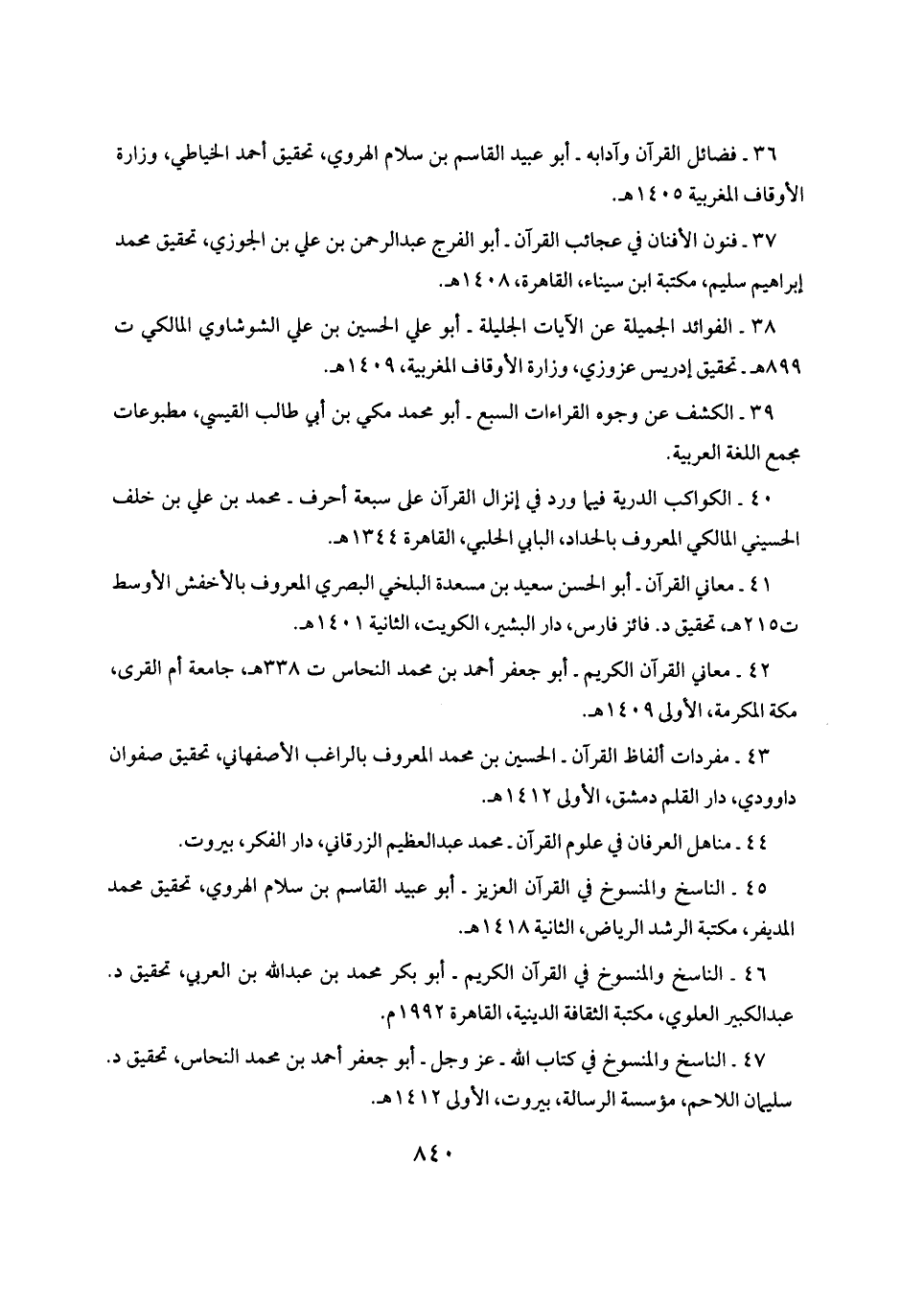 ٣٧ - فنون الأفنان في عجائب القرآن - أبو الفرج عبد الرحمن بن علي بن الجوزي، تحقيق محمد إبراهيم سليم، مكتبة ابن سيناء، القاهرة، ١٤٠٨ هـ.