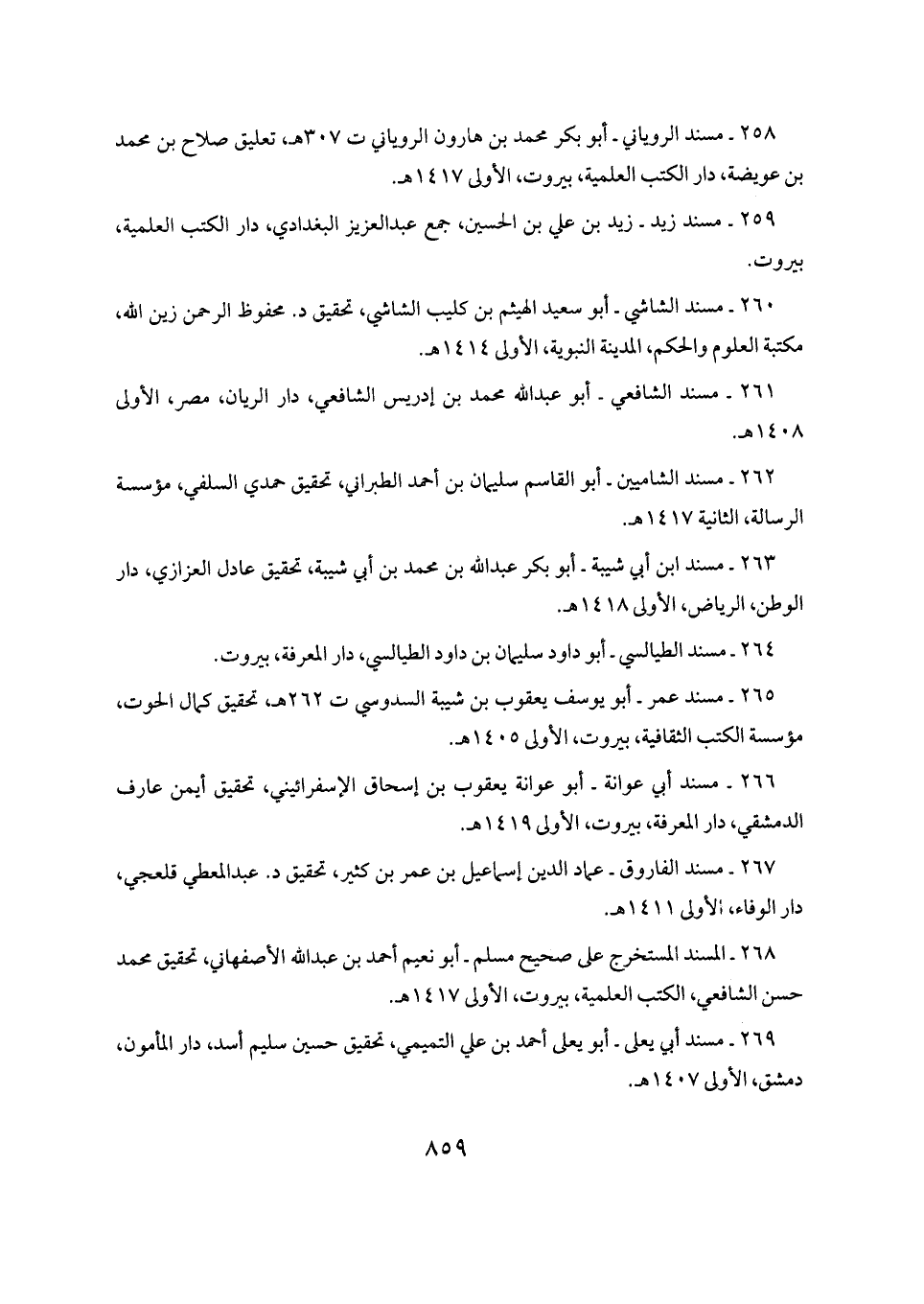 ٢٦٠ - مسند الشاشي - أبو سعيد الهيثم بن كليب الشاشي، تحقيق د. محفوظ الرحمن زين الله، مكتبة العلوم والحكم، المدينة النبوية، الأولى ١٤١٤ هـ.