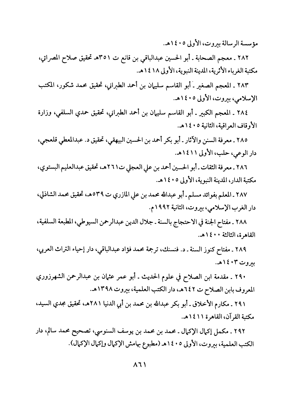 ٢٨٩ - مفتاح كنوز السنة - د. فنسنك، ترجمة محمد فؤاد عبد الباقي، دار إحياء التراث العربي، بيروت ١٤٠٣ هـ.