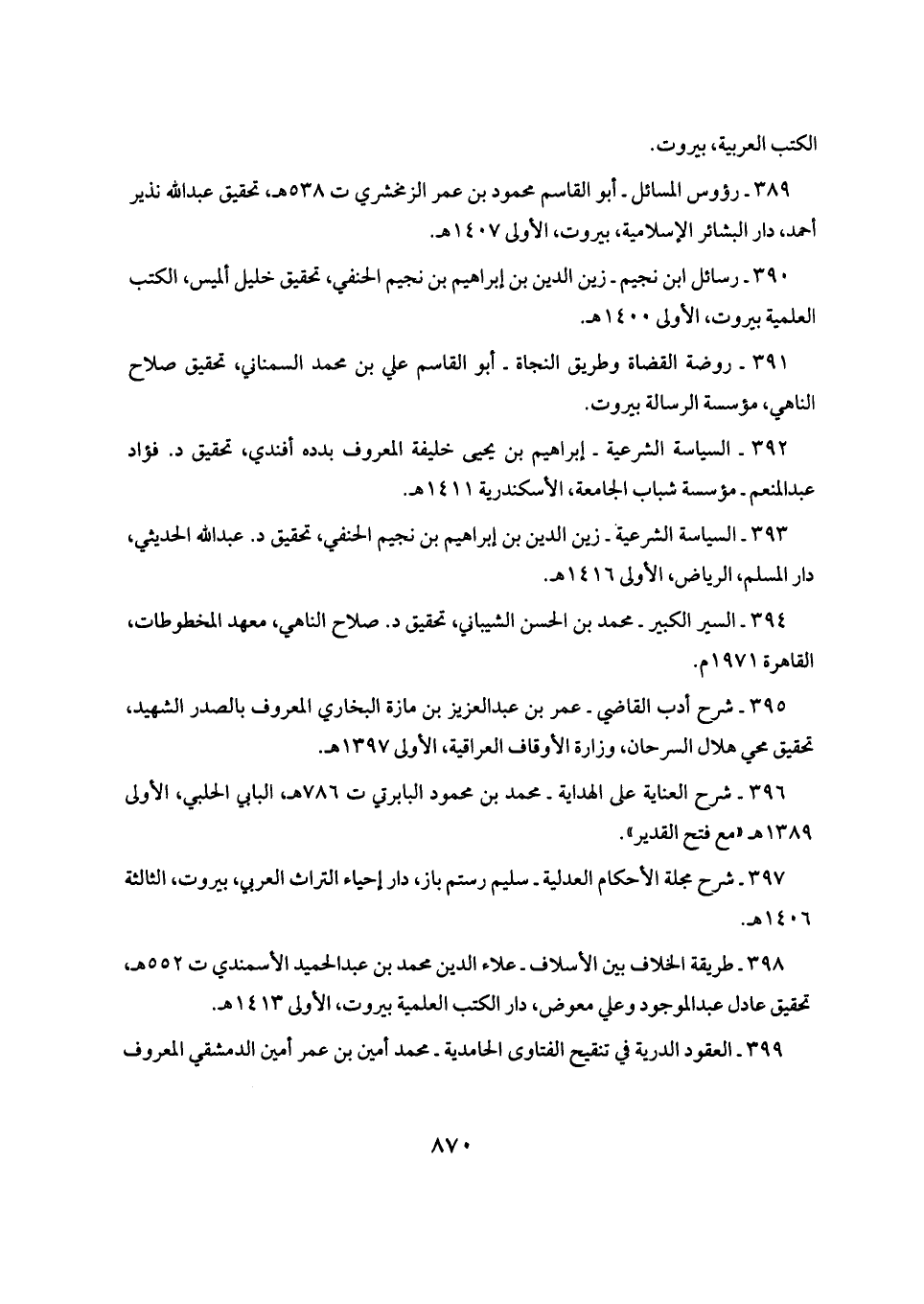 ٣٩٣ - السياسة الشرعية - زين الدين بن إبراهيم بن نجيم الحنفي، تحقيق د. عبد الله الحديثي، دار المسلم، الرياض، الأولى ١٤١٦ هـ.