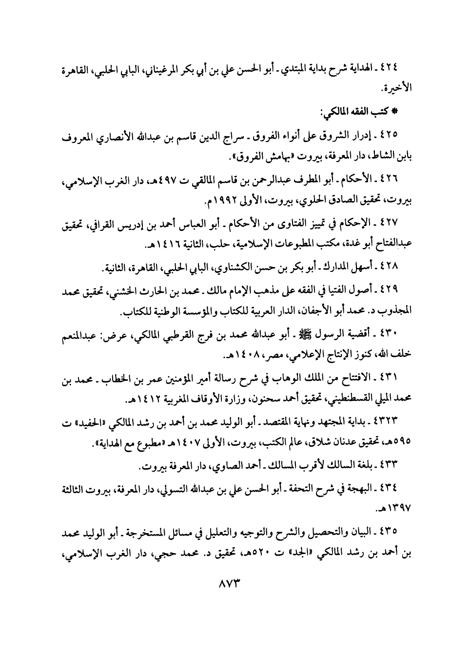 ٤٢٦ - الأحكام - أبو المطرف عبد الرحمن بن قاسم المالقي ت ٤٩٧ هـ، دار الغرب الإسلامي، بيروت، تحقيق الصادق الحلوي، بيروت، الأولى ١٩٩٢ م.