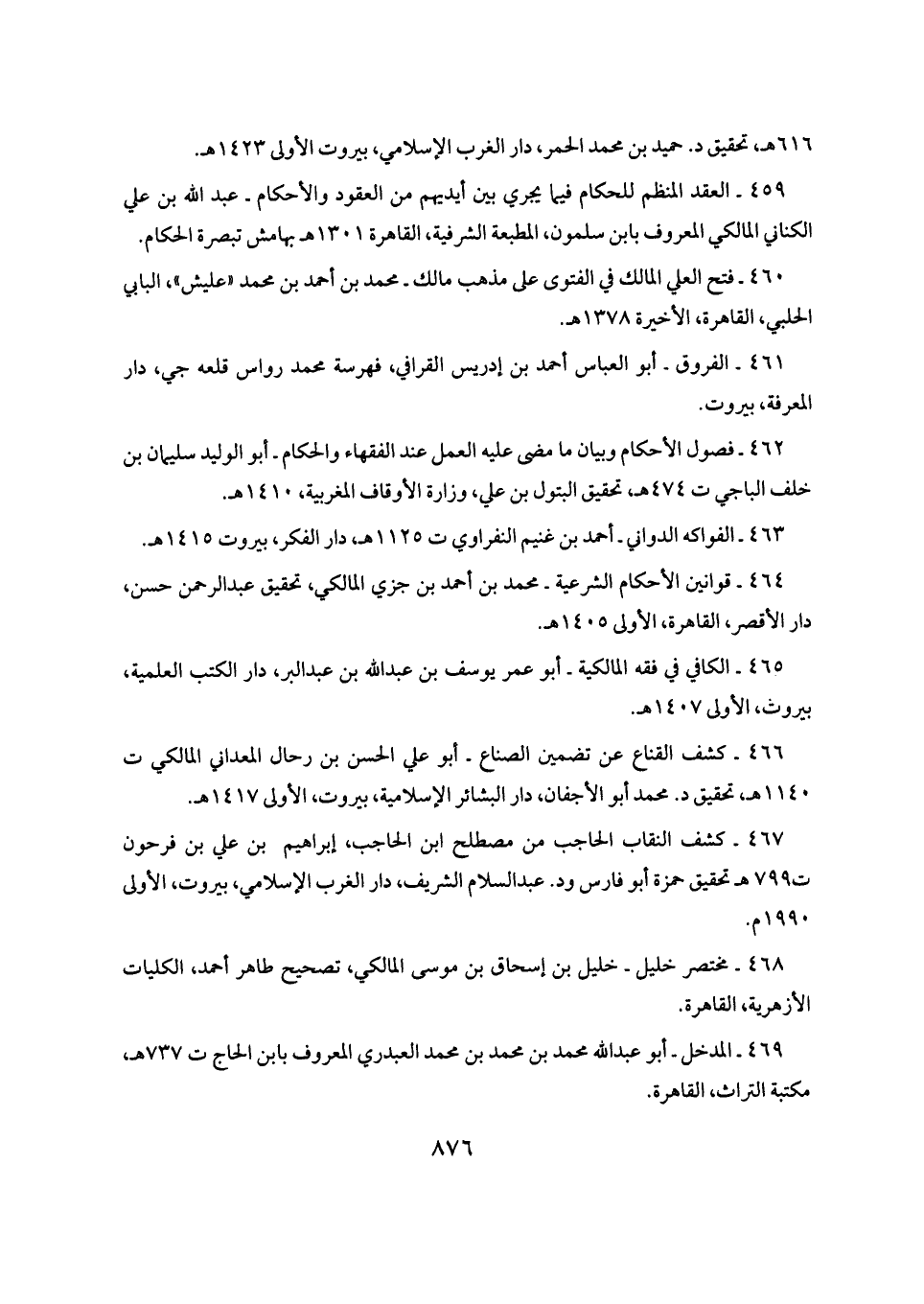 ٤٥٩ - العقد المنظم للحكام فيما يجري بين أيديهم من العقود والأحكام - عبد الله بن علي الكناني المالكي المعروف بابن سلمون، المطبعة الشرفية، القاهرة ١٣٠١ هـ بهامش تبصرة الحكام.