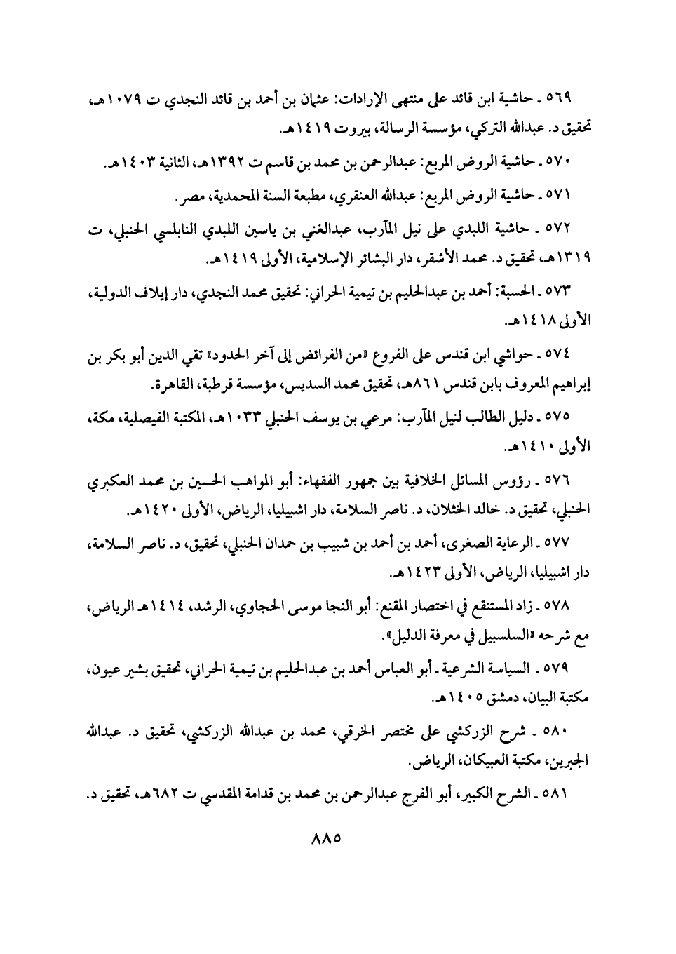 ٥٦٩ - حاشية ابن قائد على منتهى الإرادات: عثمان بن أحمد بن قائد النجدي ت ١٠٧٩ هـ، تحقيق د. عبد الله التركي، مؤسسة الرسالة، بيروت ١٤١٩ هـ.