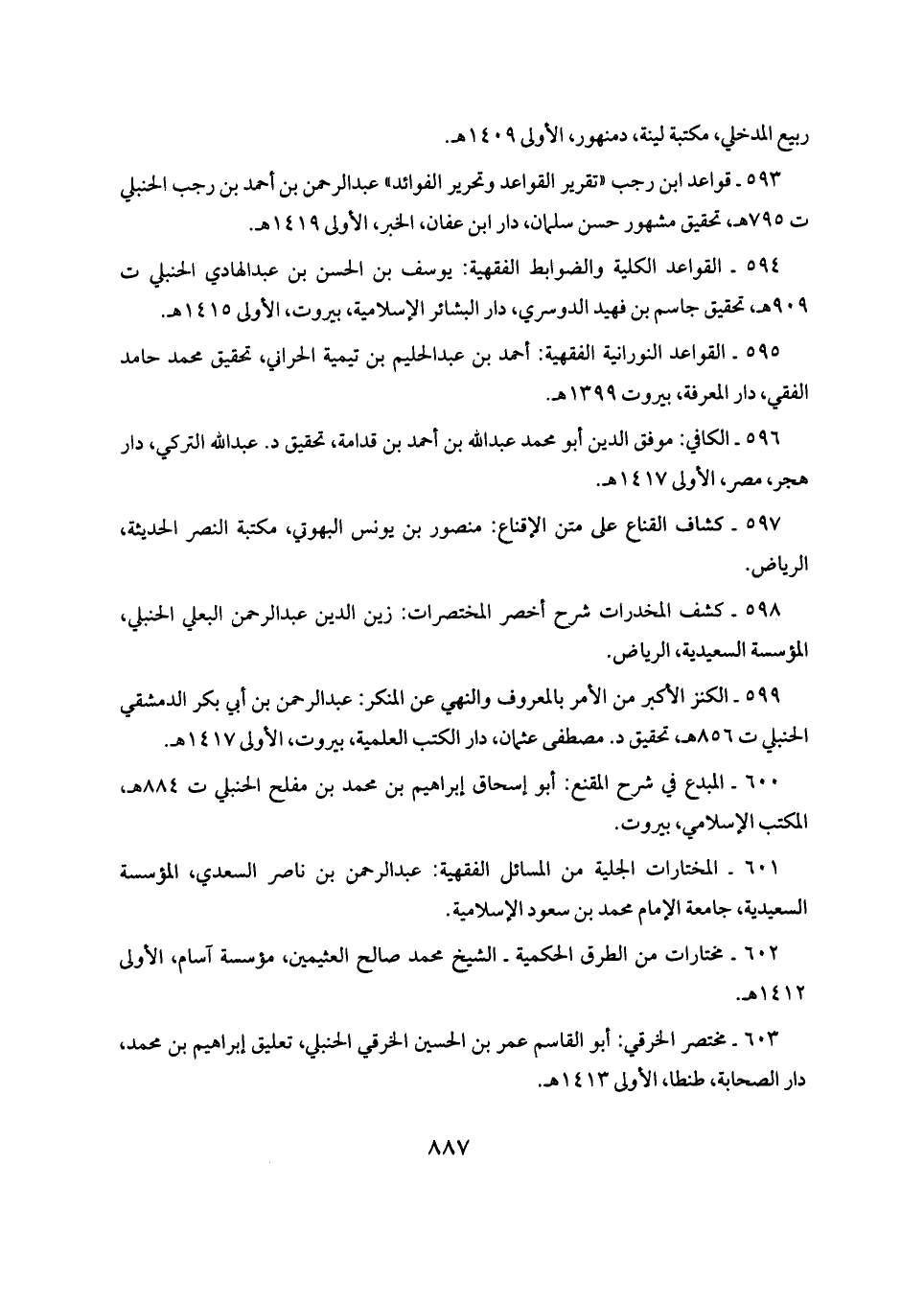 ٥٩٤ - القواعد الكلية والضوابط الفقهية: يوسف بن الحسن بن عبد الهادي الحنبلي ت ٩٠٩ هـ، تحقيق جاسم بن فهيد الدوسري، دار البشائر الإسلامية، بيروت، الأولى ١٤١٥ هـ.