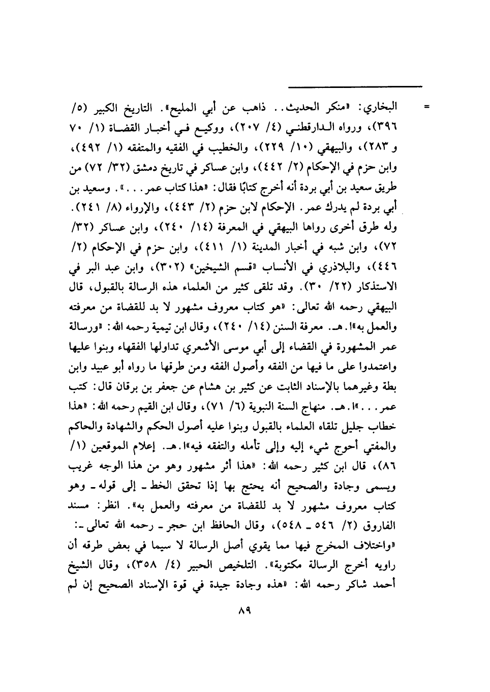 = البخاري: "منكر الحديث .. ذاهب عن أبي المليح". التاريخ الكبير (٥/ ٣٩٦)، ورواه الدارقطني (٤/ ٢٠٧)، ووكيع في أخبار القضاة (١/ ٧٠ و ٢٨٣)، والبيهقي (١٠/ ٢٢٩)، والخطيب في الفقيه والمتفقه (١/ ٤٩٢)، وابن حزم في الإحكام (٢/ ٤٤٢)، وابن عساكر في تاريخ دمشق (٣٢/ ٧٢) من طريق سعيد بن أبي بردة أنه أخرج كتابًا فقال: "هذا كتاب عمر ... ". وسعيد بن أبي بردة لم يدرك عمر. الإحكام لابن حزم (٢/ ٤٤٣)، والإرواء (٨/ ٢٤١). وله طرق أخرى رواها البيهقي في المعرفة (١٤/ ٢٤٠)، وابن عساكر (٣٢/ ٧٢)، وابن شبه في أخبار المدينة (١/ ٤١١)، وابن حزم في الإحكام (٢/ ٤٤٦)، والبلاذري في الأنساب "قسم الشيخين" (٣٠٢)، وابن عبد البر في الاستذكار (٢٢/ ٣٠). وقد تلقى كثير من العلماء هذه الرسالة بالقبول، قال البيهقي رحمه الله تعالى: "هو كتاب معروف مشهور لا بد للقضاة من معرفته والعمل به" ا. هـ. معرفة السنن (١٤/ ٢٤٠)، وقال ابن تيمية رحمه الله: "ورسالة عمر المشهورة في القضاء إلى أبي موسى الأشعري تداولها الفقهاء وبنوا عليها واعتمدوا على ما فيها من الفقه وأصول الفقه ومن طرقها ما رواه أبو عبيد وابن بطة وغيرهما بالإسناد الثابت عن كثير بن هشام عن جعفر بن برقان قال: كتب عمر ... " ا. هـ. منهاج السنة النبوية (٦/ ٧١)، وقال ابن القيم رحمه الله: "هذا خطاب جليل تلقاه العلماء بالقبول وبنوا عليه أصول الحكم والشهادة والحاكم والمفتي أحوج شيء إليه وإلى تأمله والتفقه فيه" ا. هـ. إعلام الموقعين (١/ ٨٦)، قال ابن كثير رحمه الله: "هذا أثر مشهور وهو من هذا الوجه غريب ويسمى وجادة والصحيح أنه يحتج بها إذا تحقق الخط - إلى قوله - وهو كتاب معروف مشهور لا بد للقضاة من معرفته والعمل به". انظر: مسند الفاروق (٢/ ٥٤٦ - ٥٤٨)، وقال الحافظ ابن حجر - رحمه الله تعالى -: "واختلاف المخرج فيها مما يقوي أصل الرسالة لا سيما في بعض طرقه أن راويه أخرج الرسالة مكتوبة". التلخيص الحبير (٤/ ٣٥٨)، وقال الشيخ أحمد شاكر رحمه الله: "هذه وجادة جيدة في قوة الإسناد الصحيح إن لم