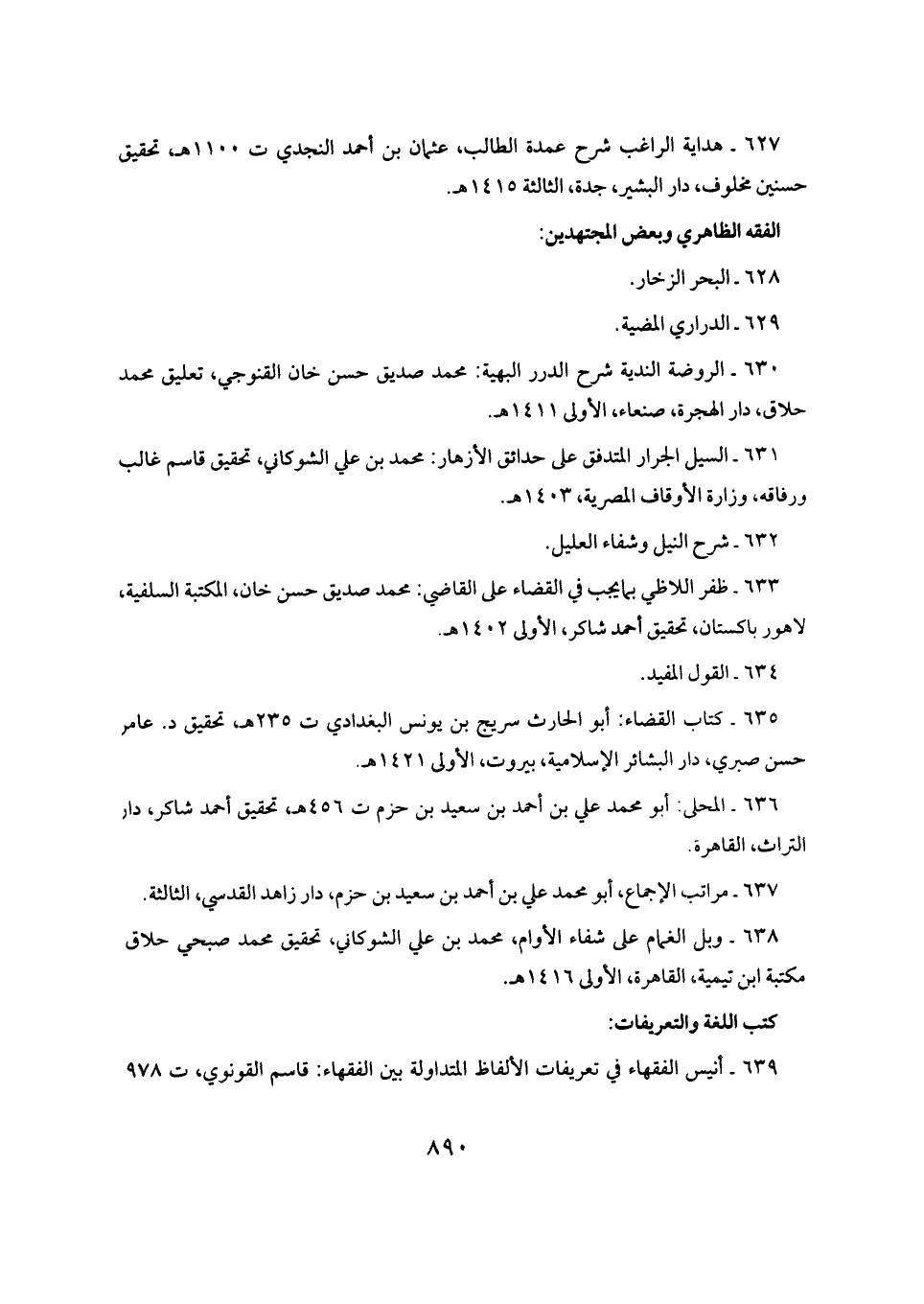 ٦٣١ - السيل الجرار المتدفق على حدائق الأزهار: محمد بن علي الشوكاني، تحقيق قاسم غالب ورفاقه، وزارة الأوقاف المصرية، ١٤٠٣ هـ.