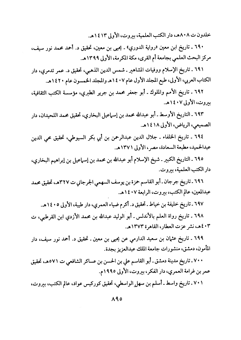٦٩١ - تاريخ الإسلام ووفيات المشاهير - شمس الدين الذهبي، تحقيق د. عمر تدمري، دار الكتاب العربي، الأولى، طبع المجلد الأول عام ١٤٠٧ هـ والمجلد الخمسون عام ١٤٢٠ هـ.