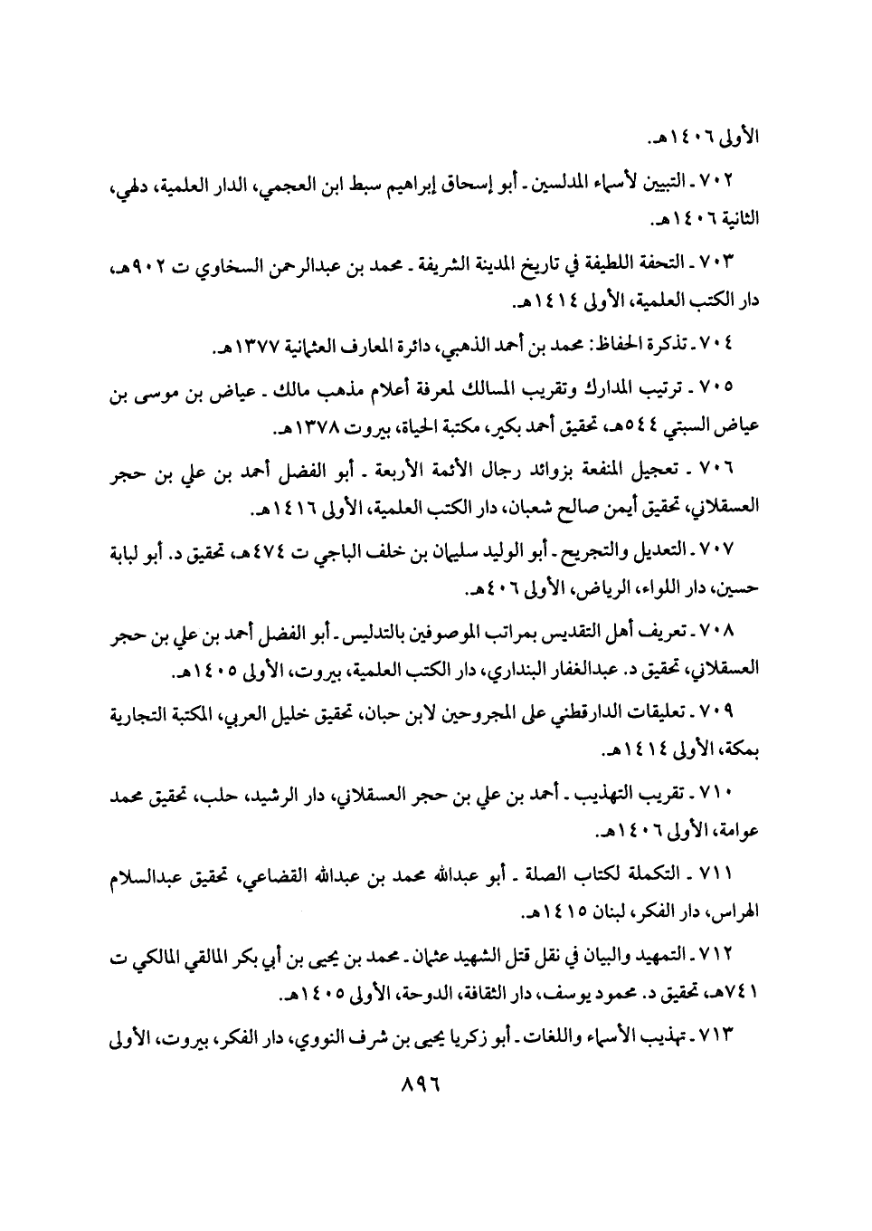٧٠٢ - التبيين لأسماء المدلسين - أبو إسحاق إبراهيم سبط ابن العجمي، الدار العلمية، دلهي، الثانية ١٤٠٦ هـ.