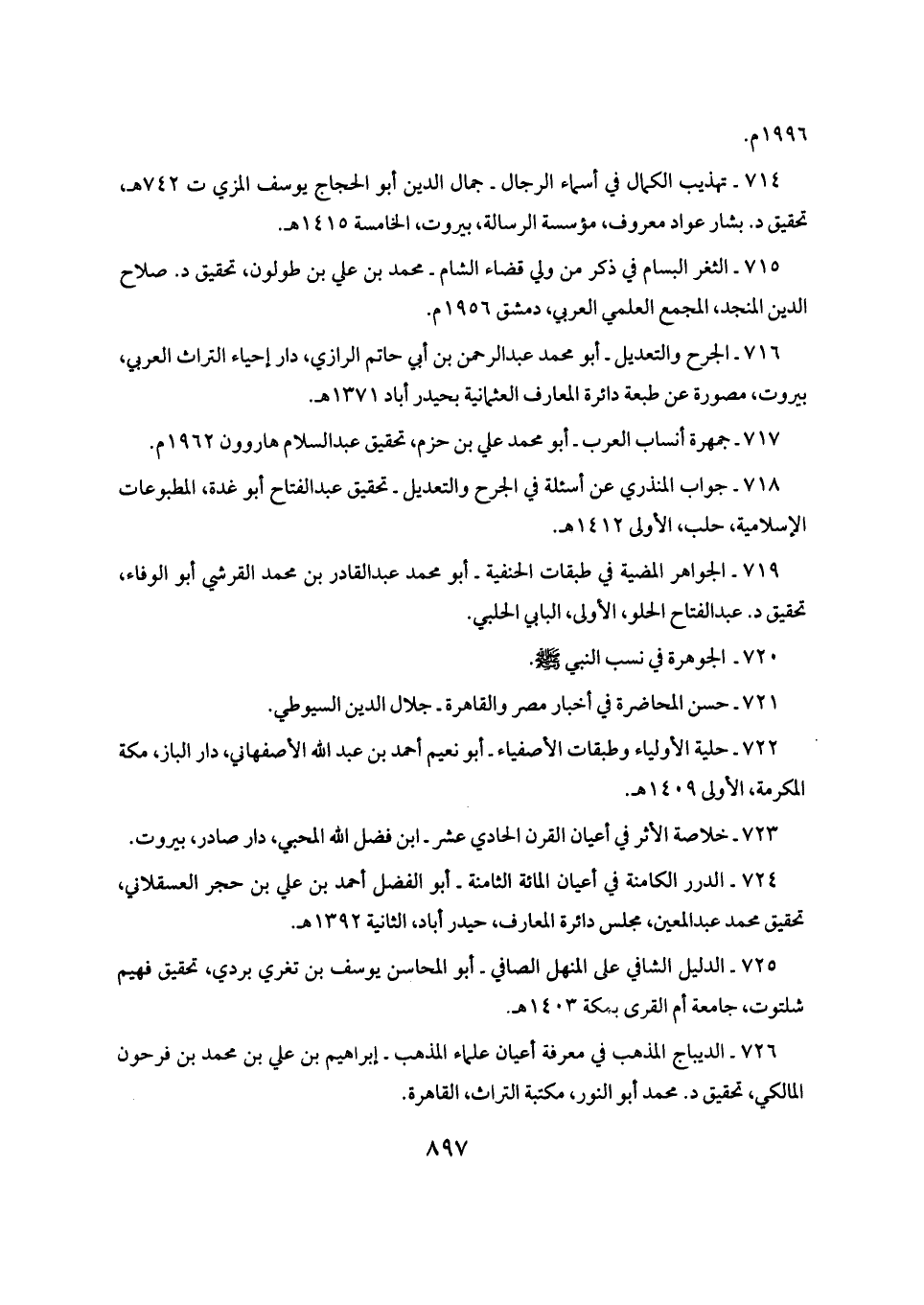 ٧٢٦ - الديباج المذهب في معرفة أعيان علماء المذهب - إبراهيم بن علي بن محمد بن فرحون المالكي، تحقيق د. محمد أبو النور، مكتبة التراث، القاهرة.