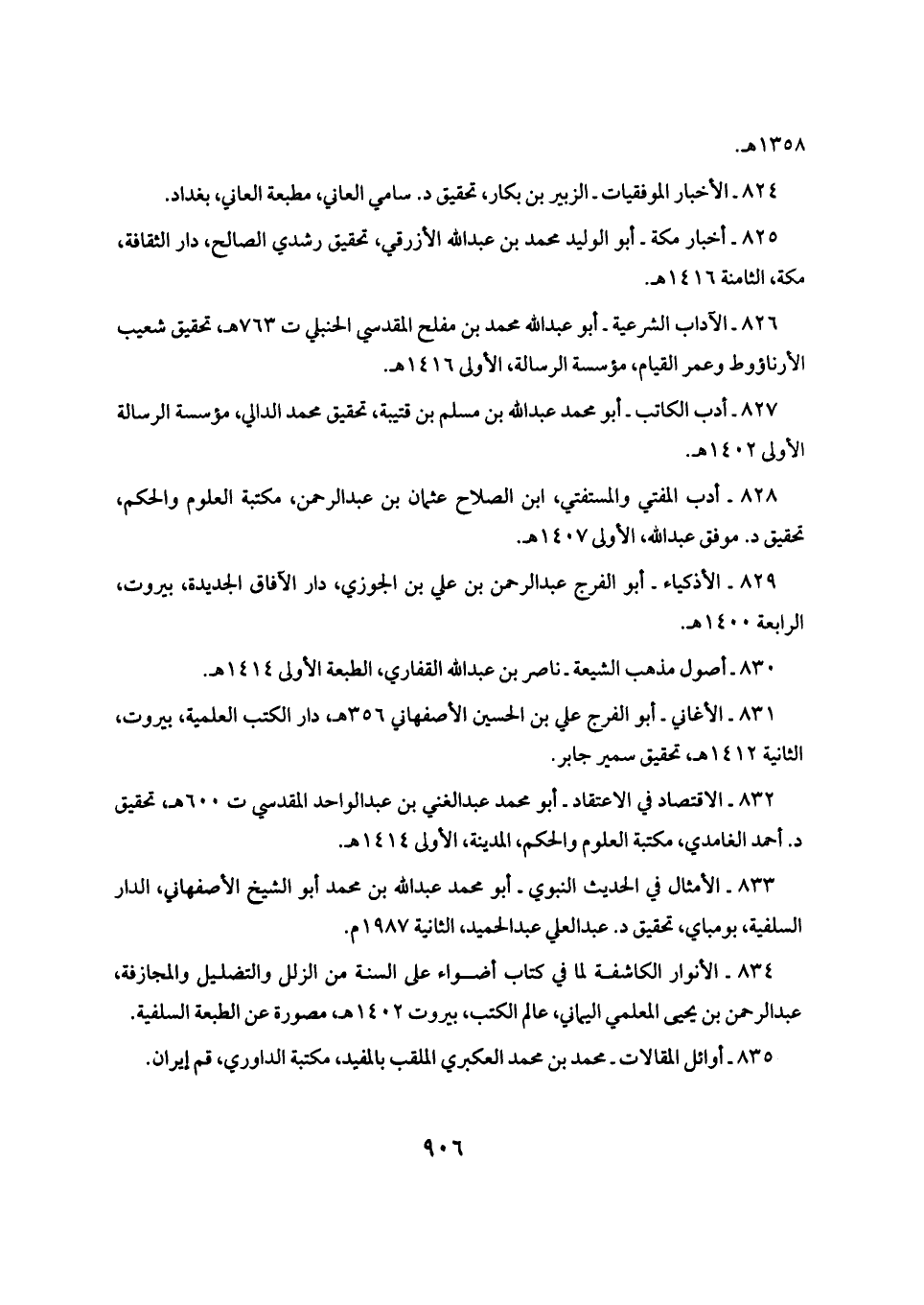 ٨٢٦ - الآداب الشرعية - أبو عبد الله محمَّد بن مفلح المقدسي الحنبلي ت ٧٦٣ هـ، تحقيق شعيب الأرناؤوط وعمر القيام، مؤسسة الرسالة، الأولى ١٤١٦ هـ.