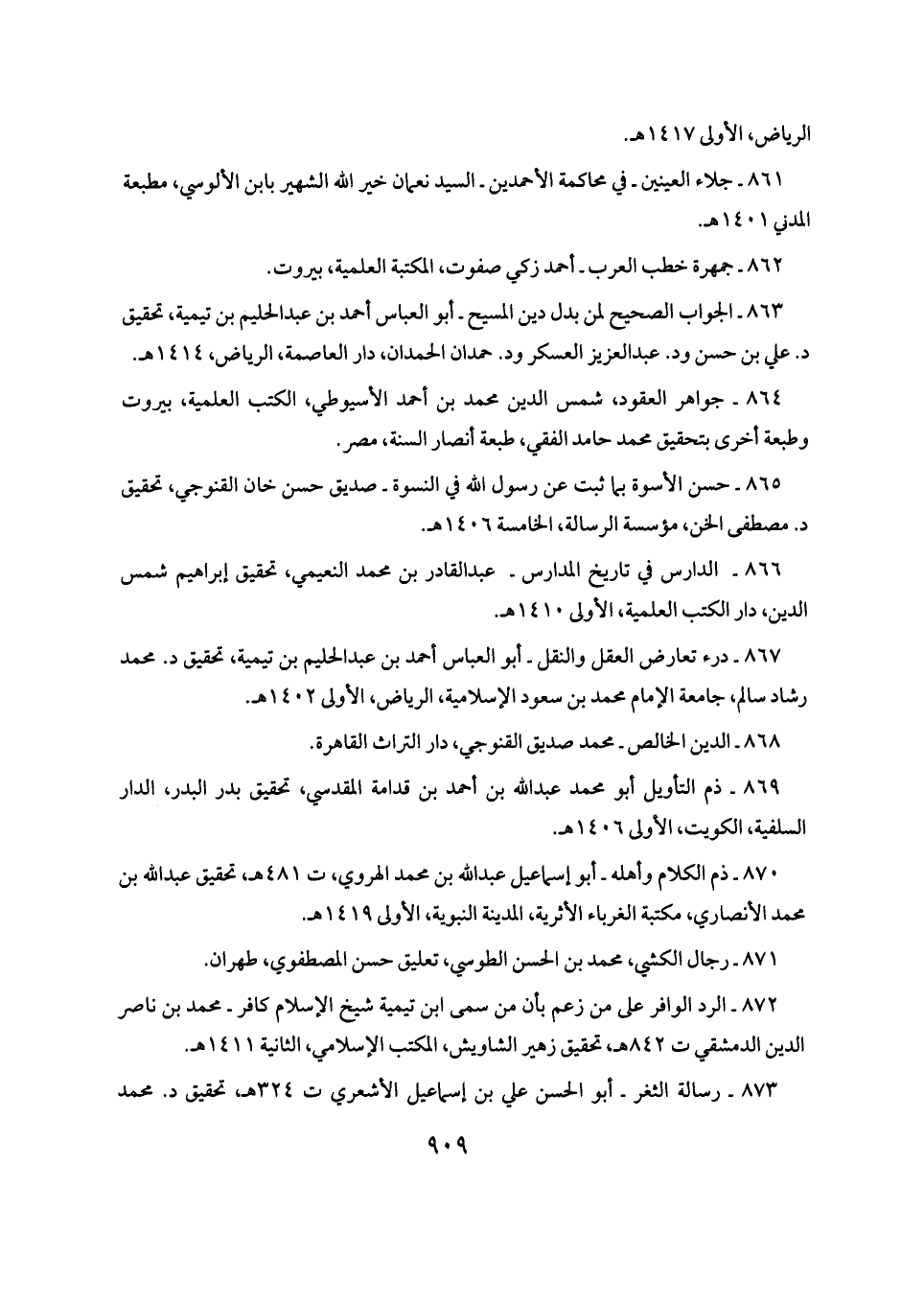 ٨٦٧ - درء تعارض العقل والنقل - أبو العباس أحمد بن عبد الحليم بن تيمية، تحقيق د. محمَّد رشاد سالم، جامعة الإمام محمَّد بن سعود الإِسلامية، الرياض، الأولى ١٤٠٢ هـ.
