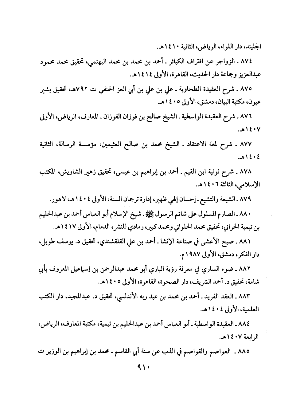 ٨٨٤ - العقيدة الواسطية - أبو العباس أحمد بن عبد الحليم بن تيمية، مكتبة المعارف، الرياض، الرابعة ١٤٠٧ هـ.