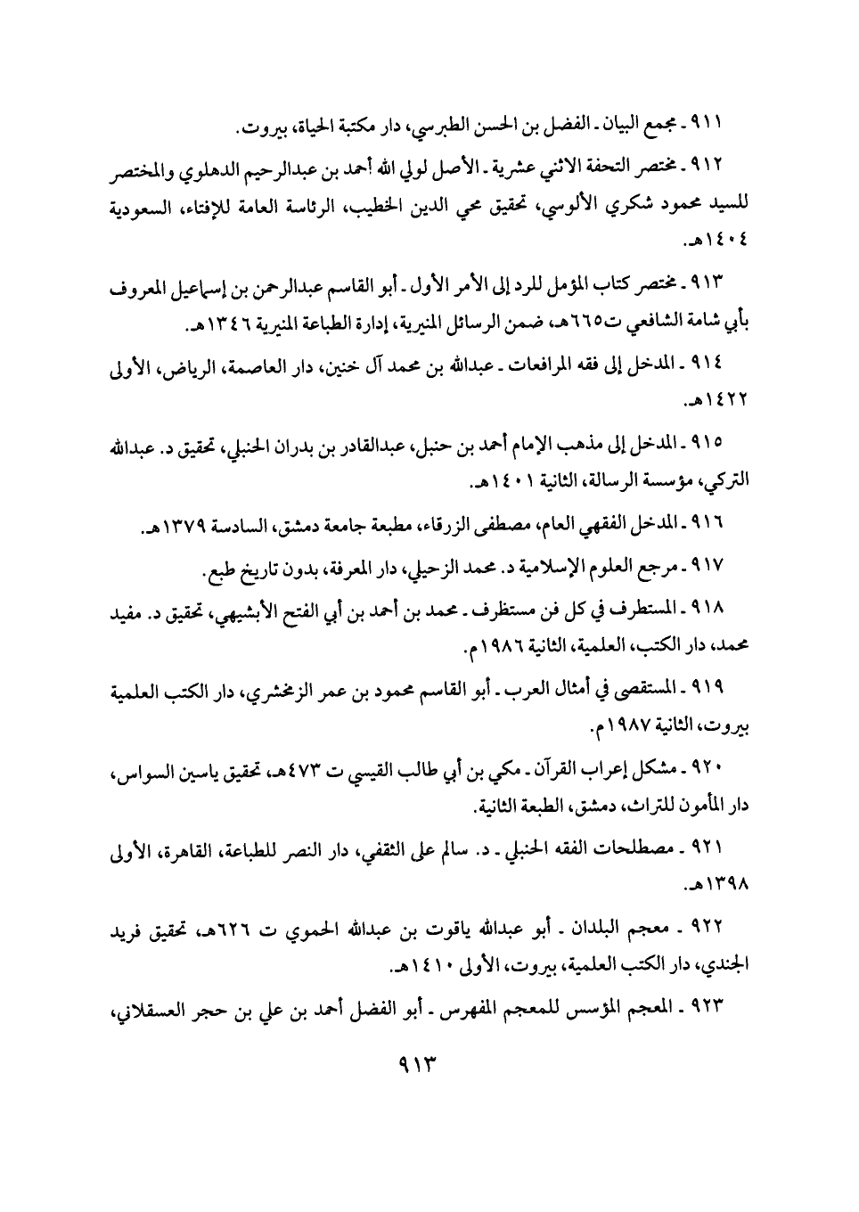 ٩١٧ - مرجع العلوم الإِسلامية د. محمَّد الزحيلي، دار المعرفة، بدون تاريخ طبع.