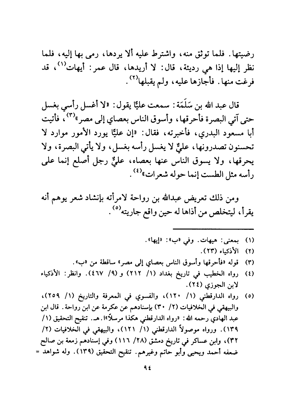 (¬٥) رواه الدارقطني (١/ ١٢٠)، والفسوي في المعرفة والتاريخ (١/ ٢٥٩)، والبيهقي في الخلافيات (٢/ ٣٠) بإسنادهم عن عكرمة عن ابن رواحة. قال ابن عبد الهادي رحمه الله: "رواه الدارقطني هكذا مرسلًا" ا. هـ. تنقيح التحقيق (١/ ١٣٩). ورواه موصولًا الدارقطني (١/ ١٢١)، والبيهقي في الخلافيات (٢/ ٣٢)، وابن عساكر في تاريخ دمشق (٢٨/ ١١٦) وفي إسنادهم زمعة بن صالح ضعفه أحمد ويحيى وأبو حاتم وغيرهم. تنقيح التحقيق (١٣٩). وله شواهد =