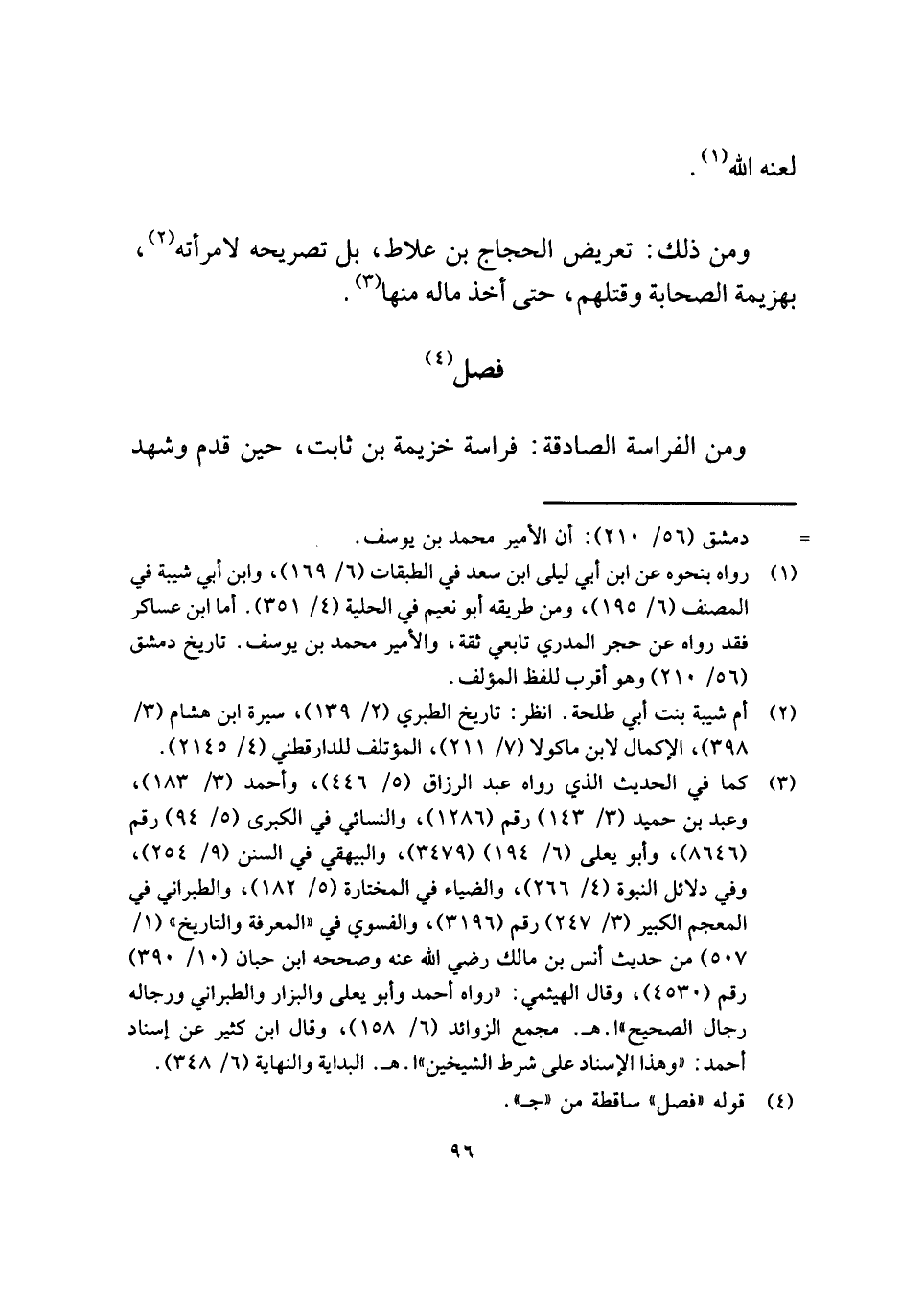 (¬٣) كما في الحديث الذي رواه عبد الرزاق (٥/ ٤٤٦)، وأحمد (٣/ ١٨٣)، وعبد بن حميد (٣/ ١٤٣) رقم (١٢٨٦)، والنسائي في الكبرى (٥/ ٩٤) رقم (٨٦٤٦)، وأبو يعلى (٦/ ١٩٤) (٣٤٧٩)، والبيهقي في السنن (٩/ ٢٥٤)، وفي دلائل النبوة (٤/ ٢٦٦)، والضياء في المختارة (٥/ ١٨٢)، والطبراني في المعجم الكبير (٣/ ٢٤٧) رقم (٣١٩٦)، والفسوي في "المعرفة والتاريخ" (١/ ٥٠٧) من حديث أنس بن مالك رضي الله عنه وصححه ابن حبان (١٠/ ٣٩٠) رقم (٤٥٣٠)، وقال الهيثمي: "رواه أحمد وأبو يعلى والبزار والطبراني ورجاله رجال الصحيح" ا. هـ. مجمع الزوائد (٦/ ١٥٨)، وقال ابن كثير عن إسناد أحمد: "وهذا الإسناد على شرط الشيخين" ا. هـ. البداية والنهاية (٦/ ٣٤٨).